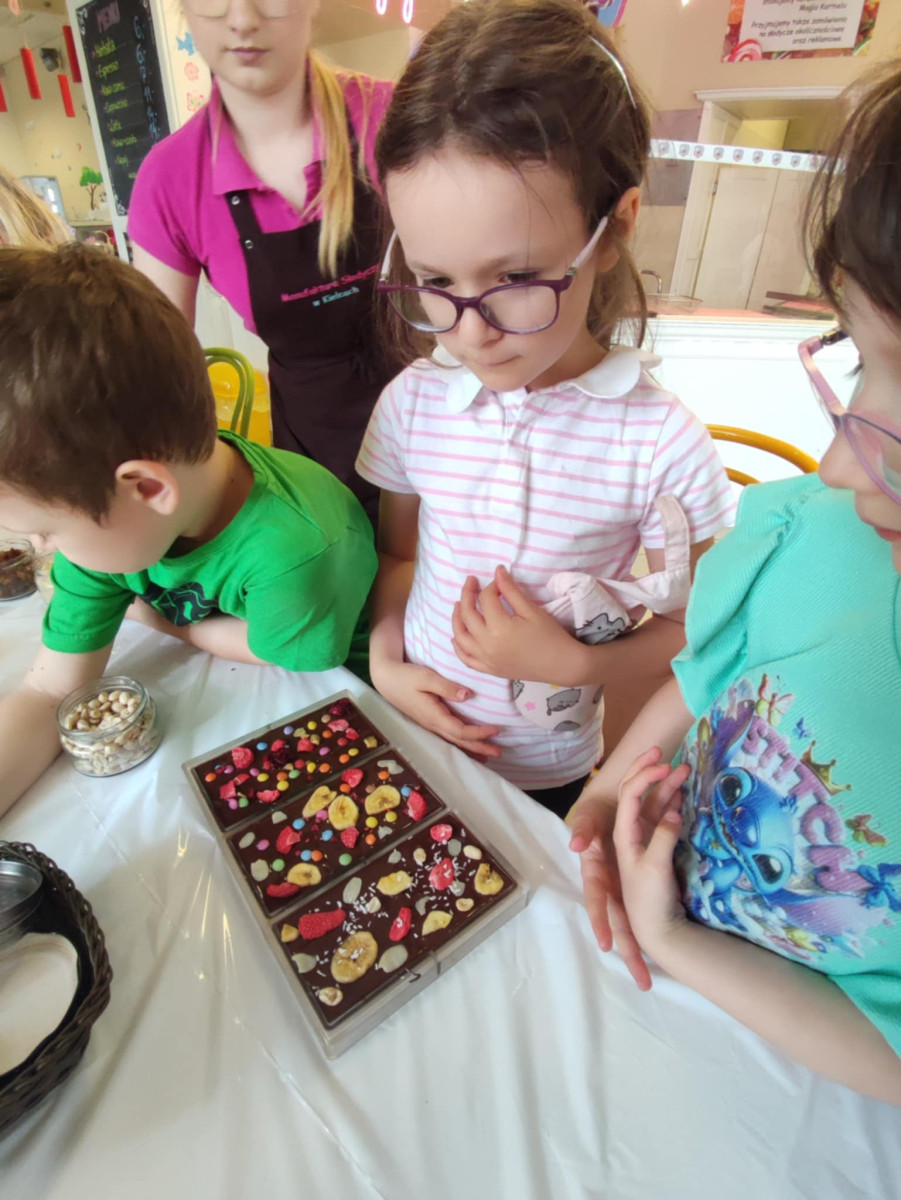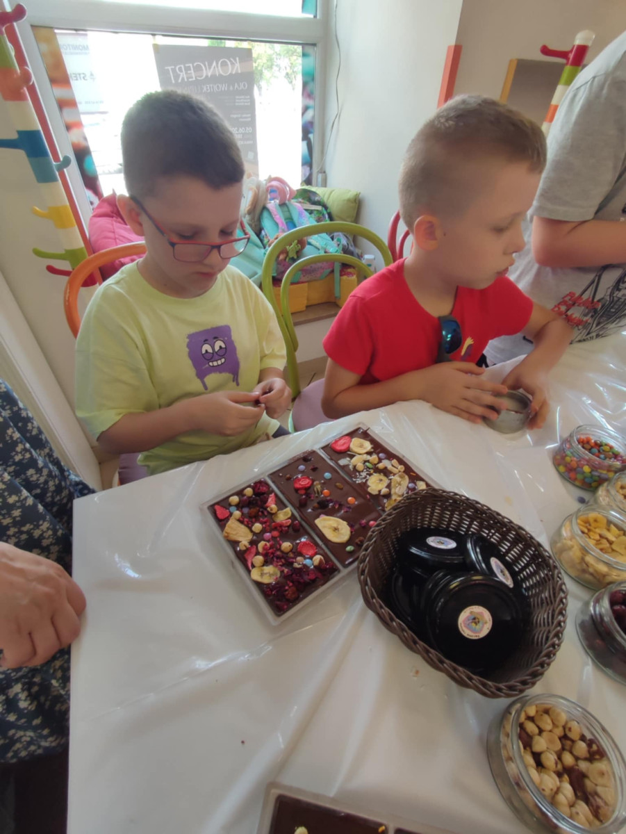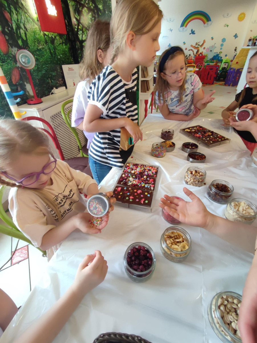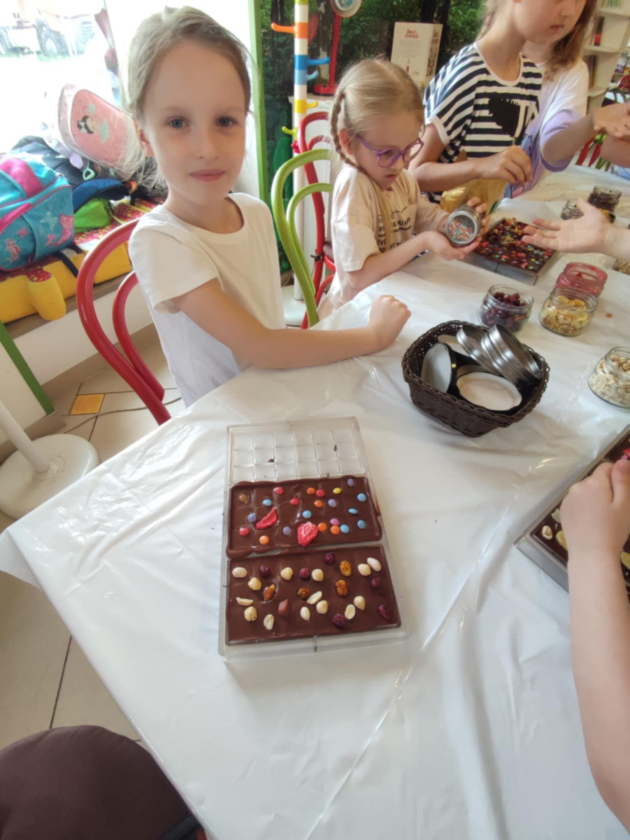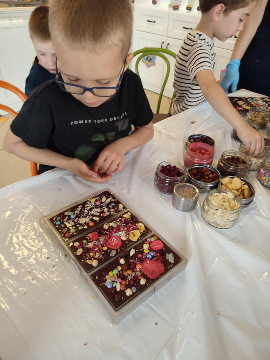 Każdy uczestnik własnoręcznie zaprojektował i stworzył swoją tabliczkę czekolady 100g, dekorując ją wybranymi dodatkami: orzechami, malinami, truskawkami, wiśniami, pomarańczą, rodzynkami, migdałami, posypkami i cukiereczkami!
