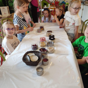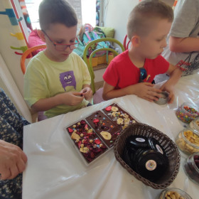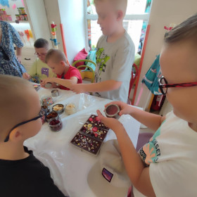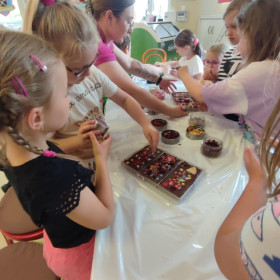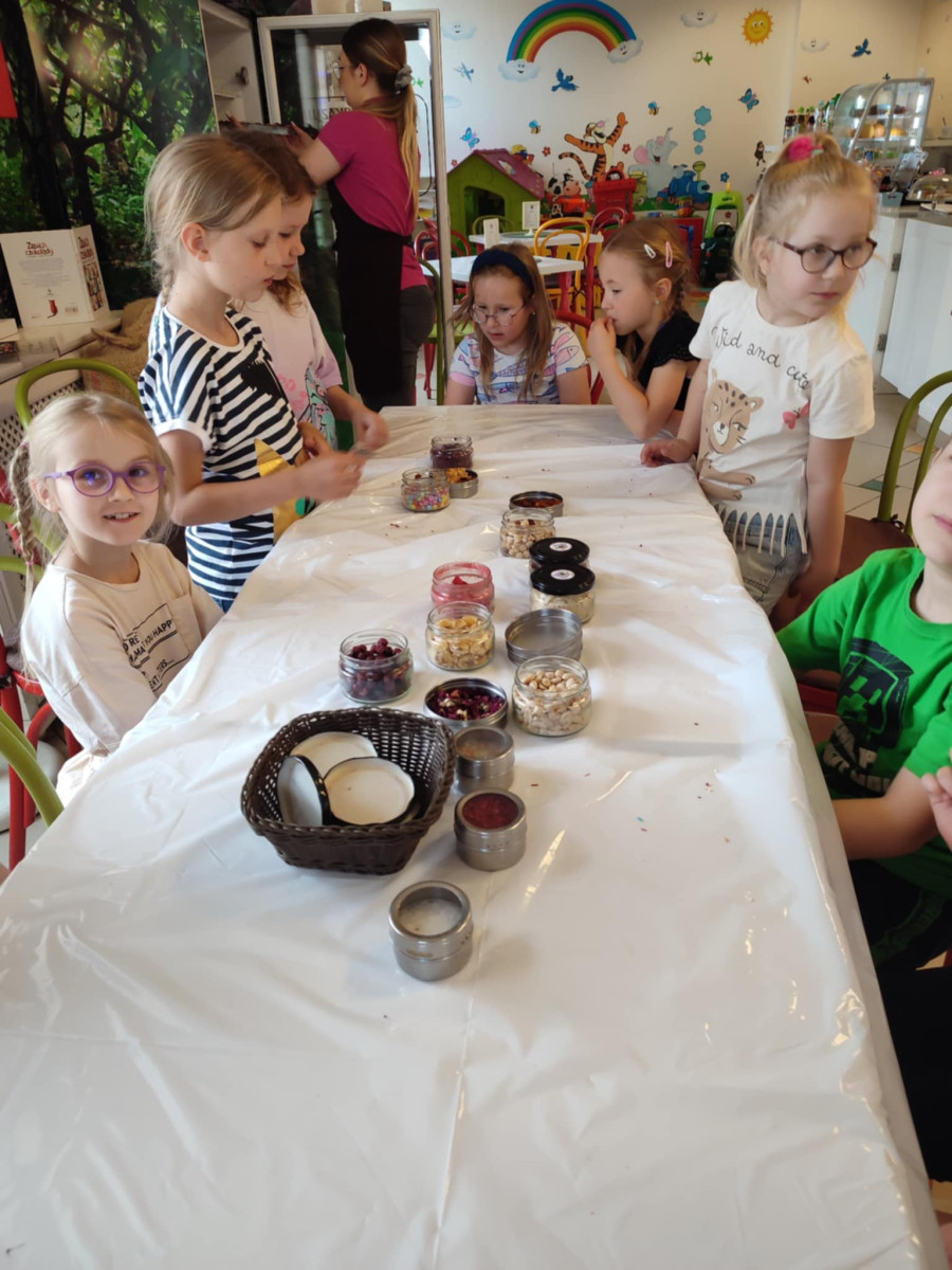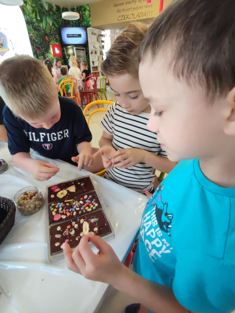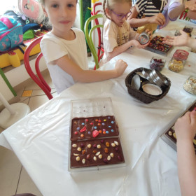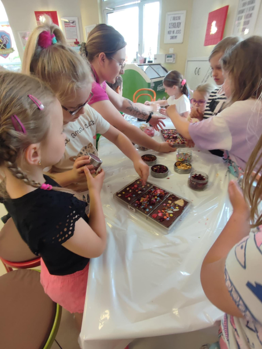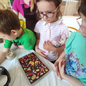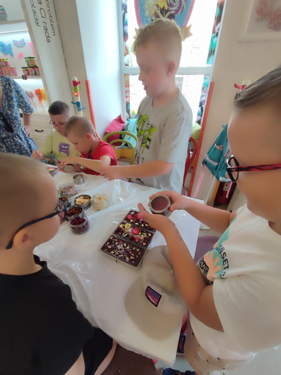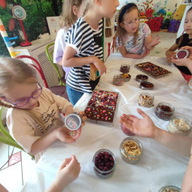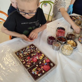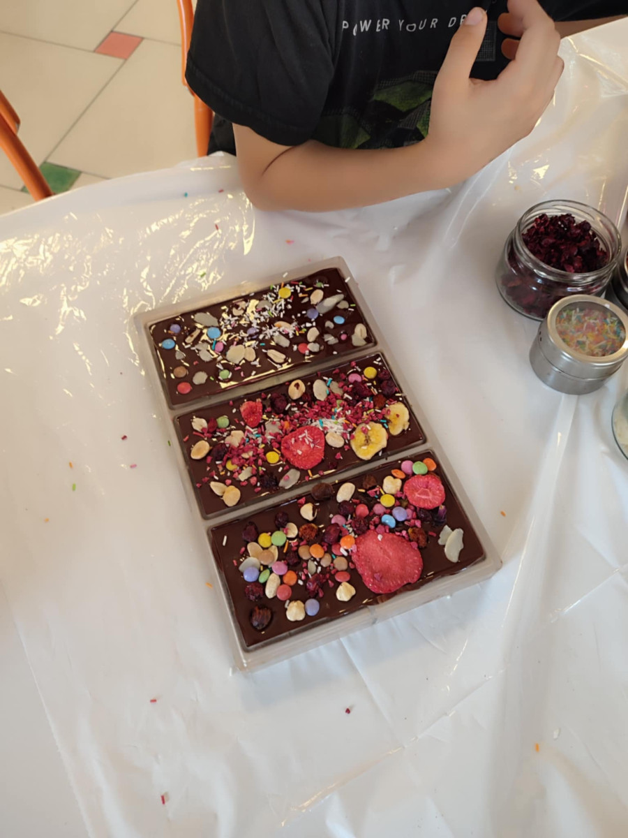 Każdy uczestnik własnoręcznie zaprojektował i stworzył swoją tabliczkę czekolady 100g, dekorując ją wybranymi dodatkami: orzechami, malinami, truskawkami, wiśniami, pomarańczą, rodzynkami, migdałami, posypkami i cukiereczkami!