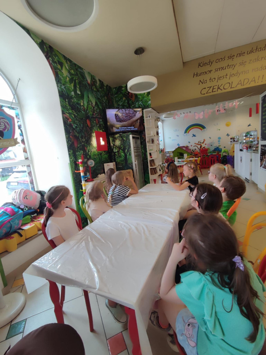 Dzięki multimedialnej prezentacji dzieci dowiedziały się, jak wygląda cały proces produkcji czekolady – od ziarna kakaowca, aż po gotową tabliczkę.
