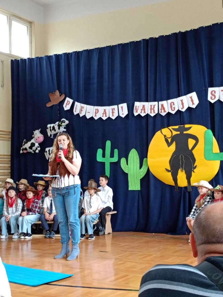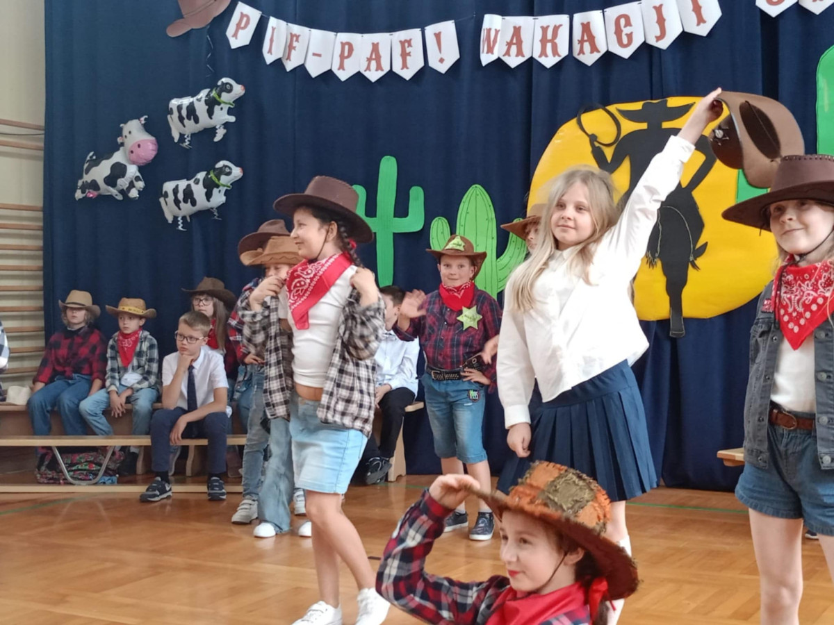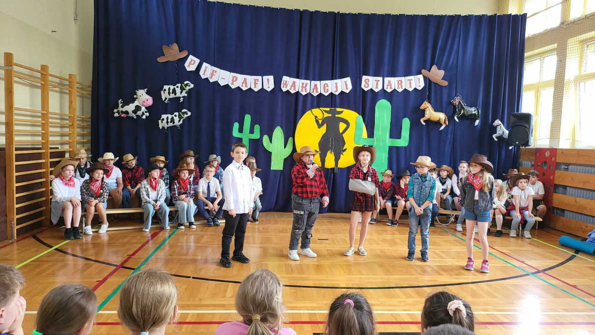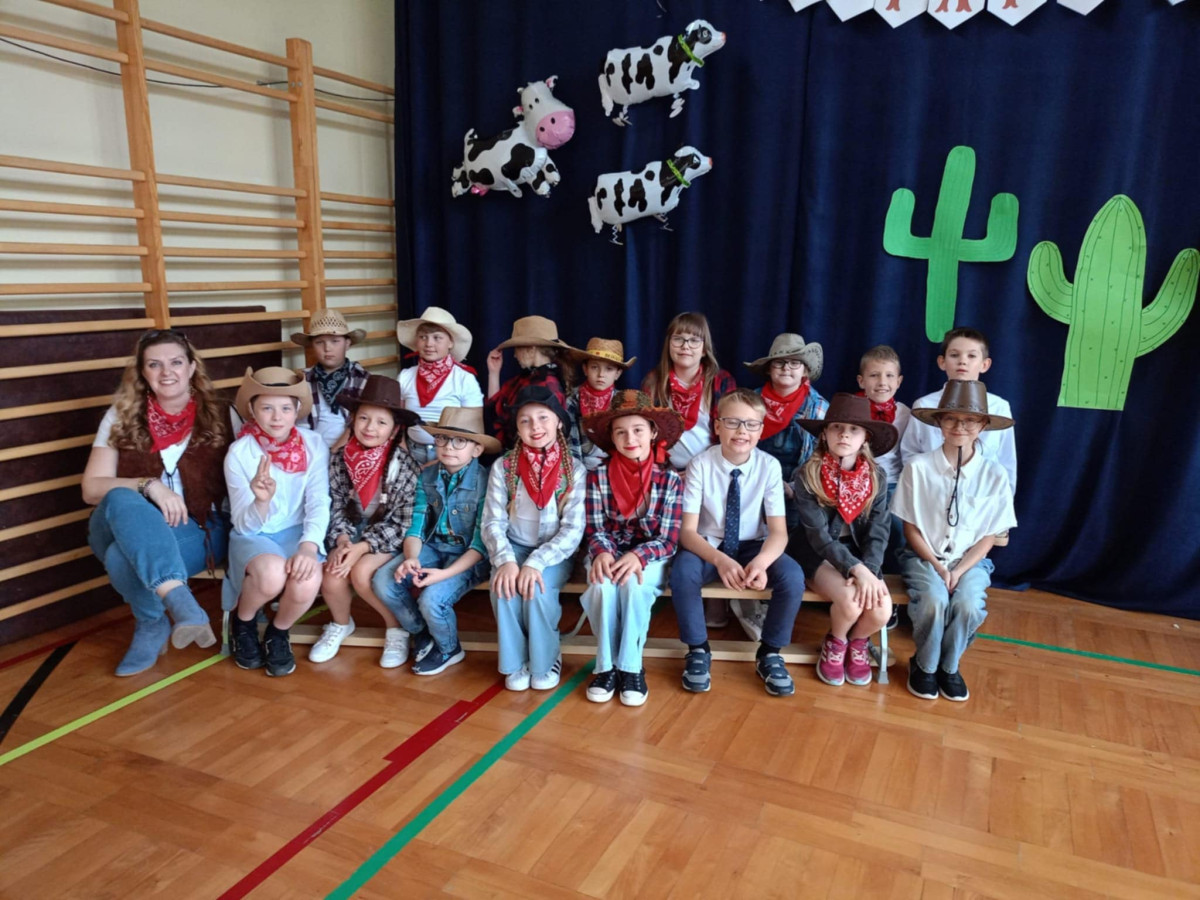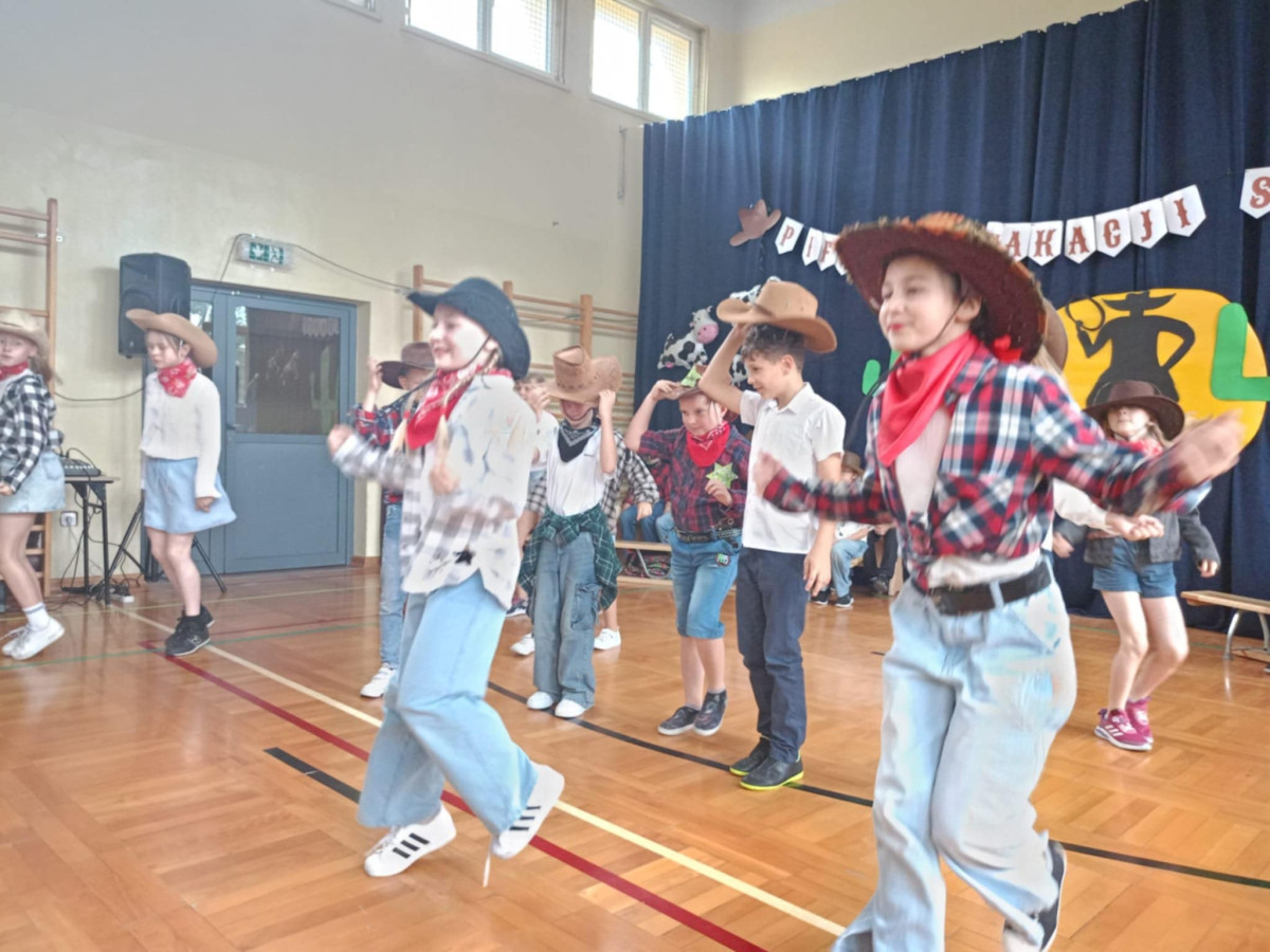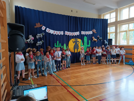 Dnia 13 czerwca, uczniowie klas 3b i 3c w niezwykle radosny i kreatywny sposób zakończyli rok szkolny, organizując wyjątkowe kowbojskie pożegnanie! Na scenie nie zabrakło piosenek w języku polskim i angielskim, które uczniowie wykonali z ogromnym zaangażowaniem i uśmiechem. Publiczność usłyszała również wiersze recytowane w obu językach – były wzruszenia, śmiech i zasłużone brawa.