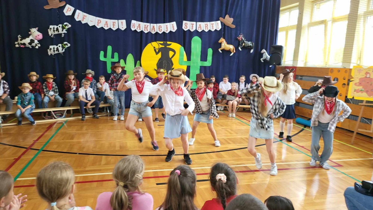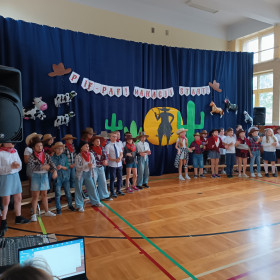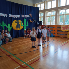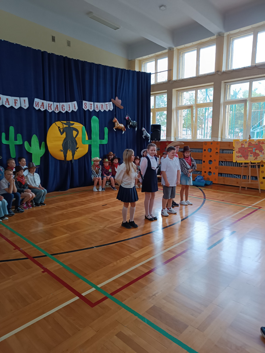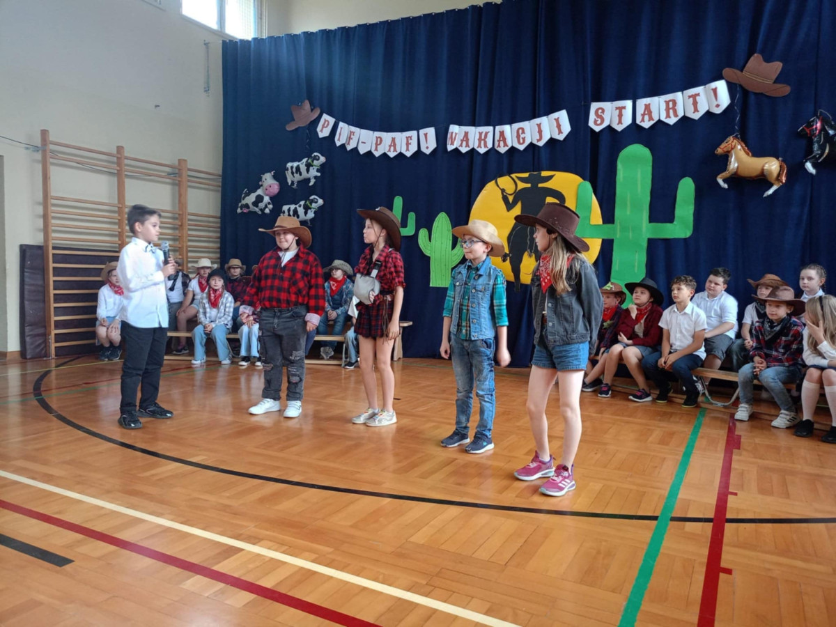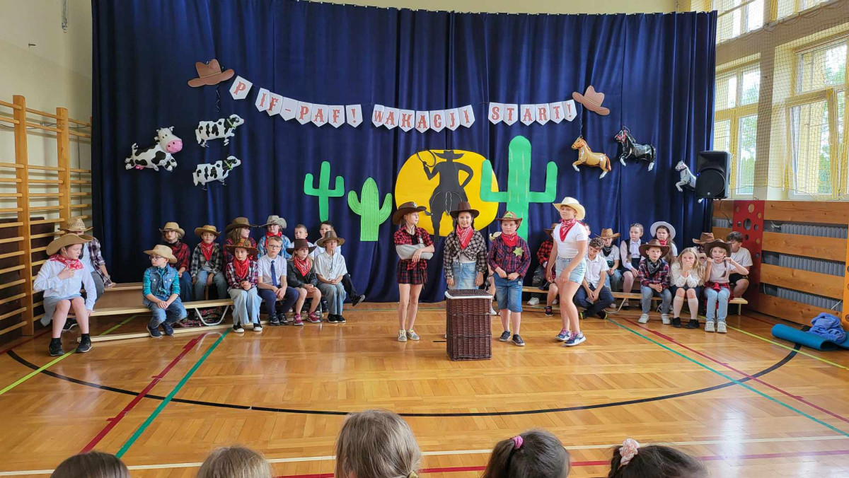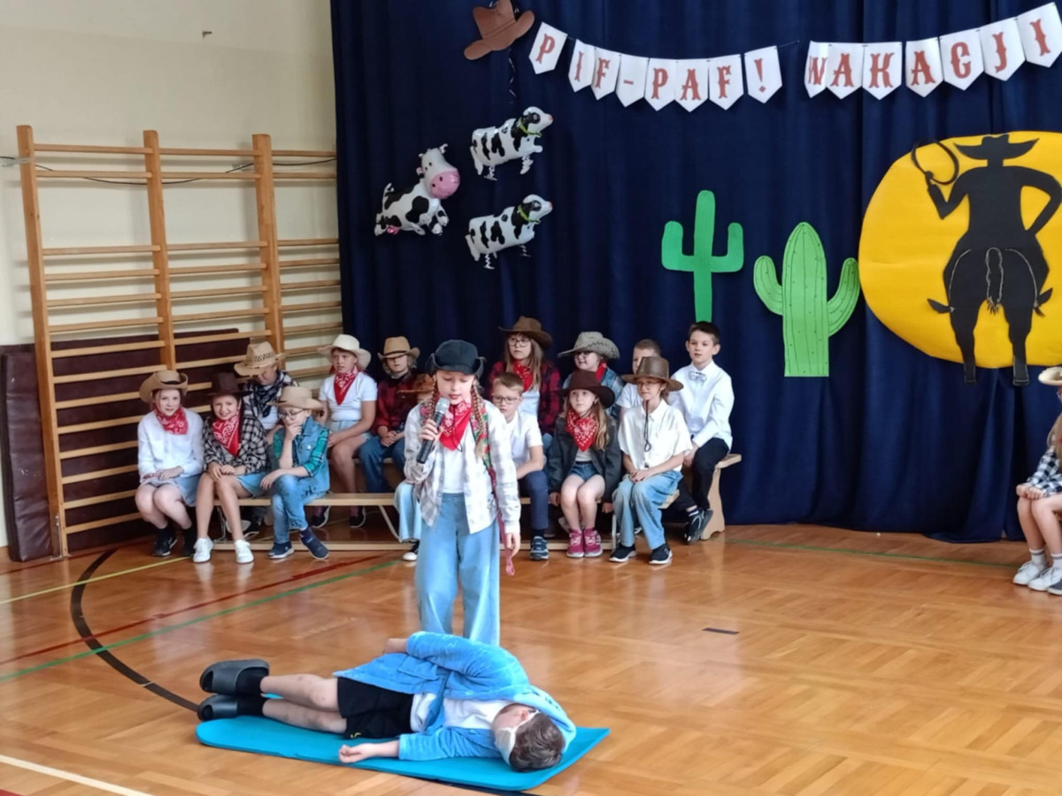 Dnia 13 czerwca, uczniowie klas 3b i 3c w niezwykle radosny i kreatywny sposób zakończyli rok szkolny, organizując wyjątkowe kowbojskie pożegnanie! Na scenie nie zabrakło piosenek w języku polskim i angielskim, które uczniowie wykonali z ogromnym zaangażowaniem i uśmiechem. Publiczność usłyszała również wiersze recytowane w obu językach – były wzruszenia, śmiech i zasłużone brawa.