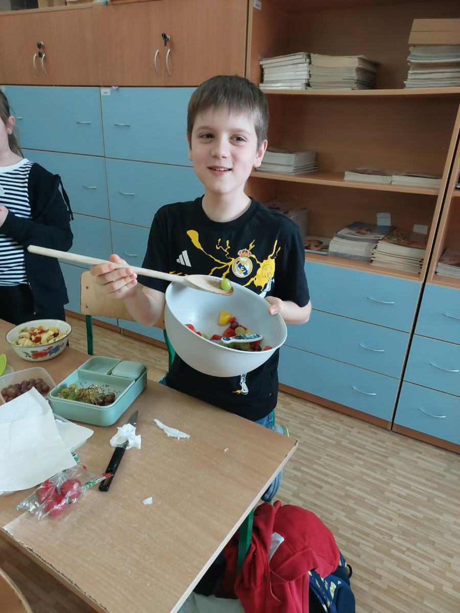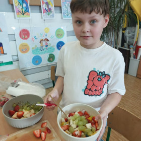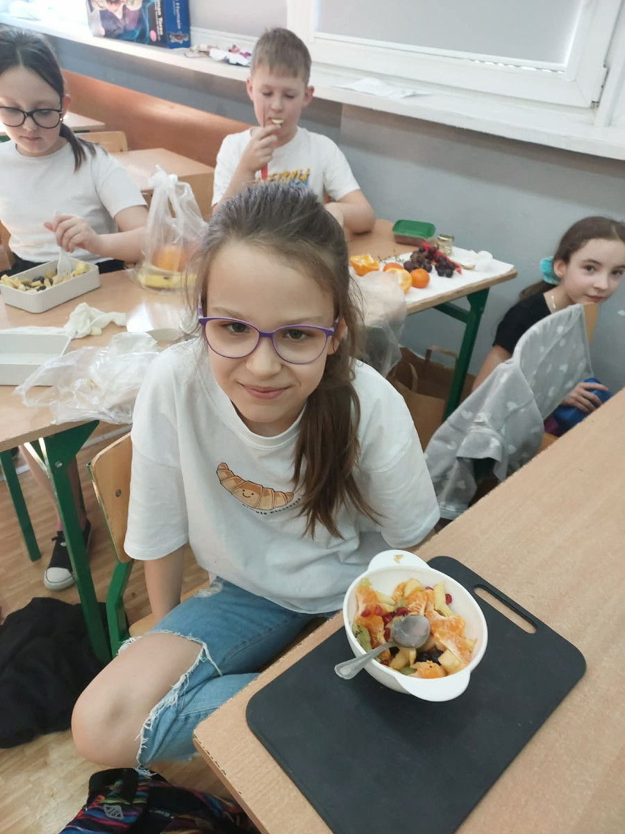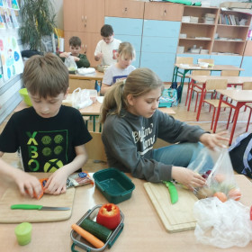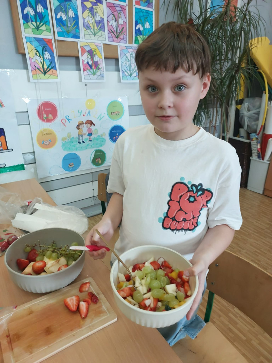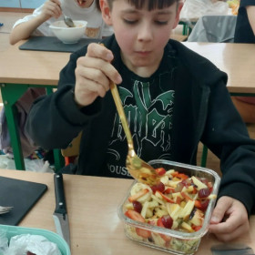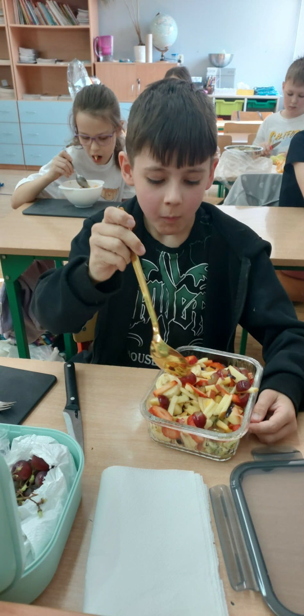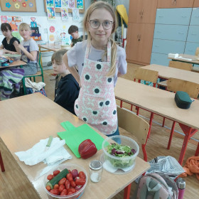 Zwieńczeniem zajęć było samodzielne przygotowanie przez dzieci sałatek warzywnych i owocowych. Uczniowie z dużym zaangażowaniem kroili, mieszali i komponowali swoje zdrowe przysmaki.