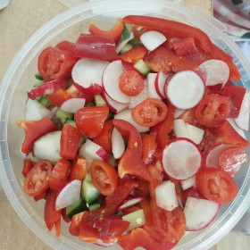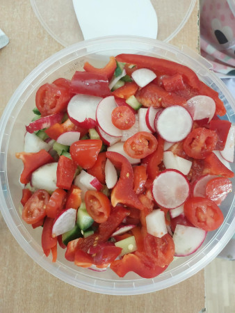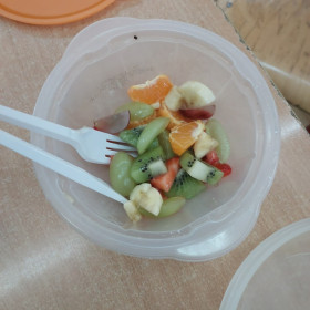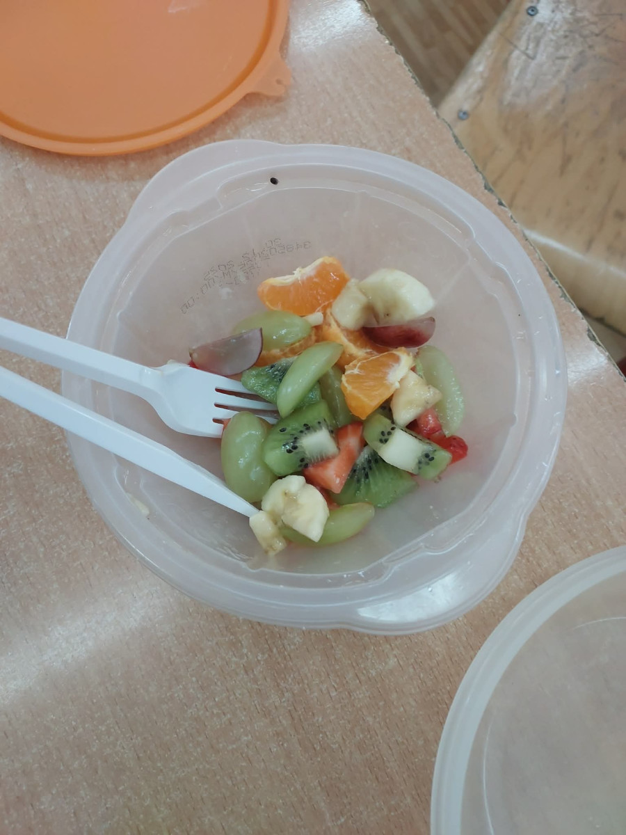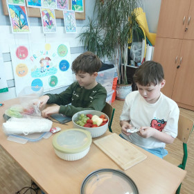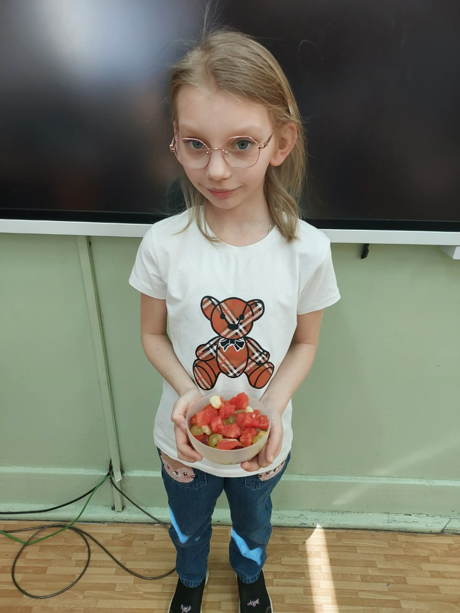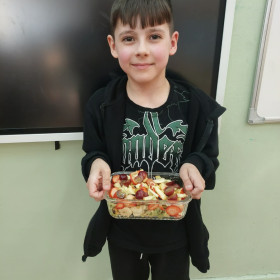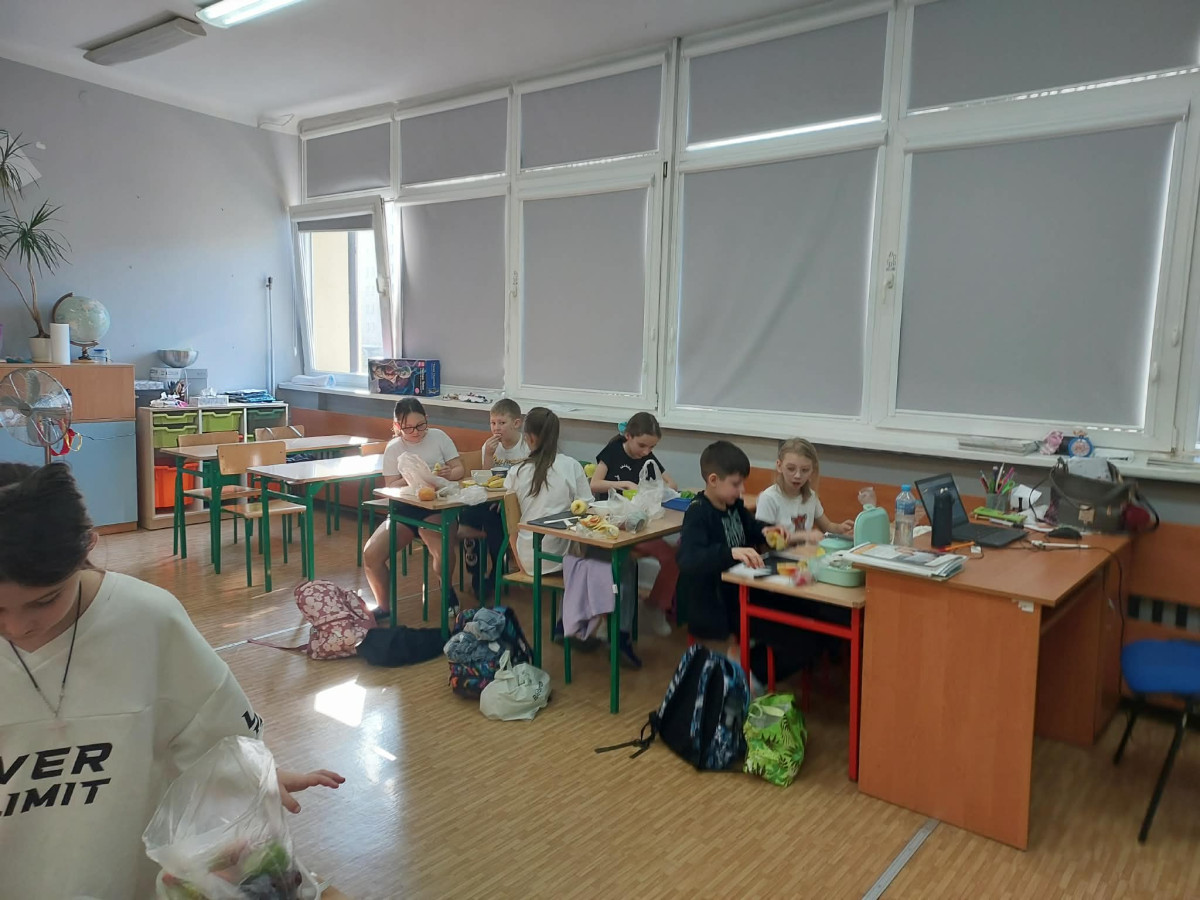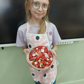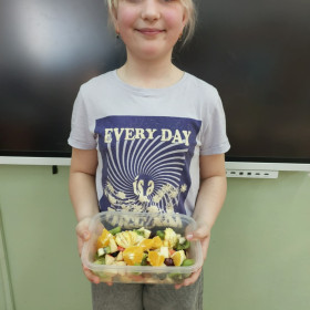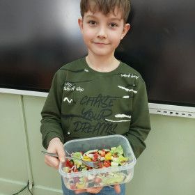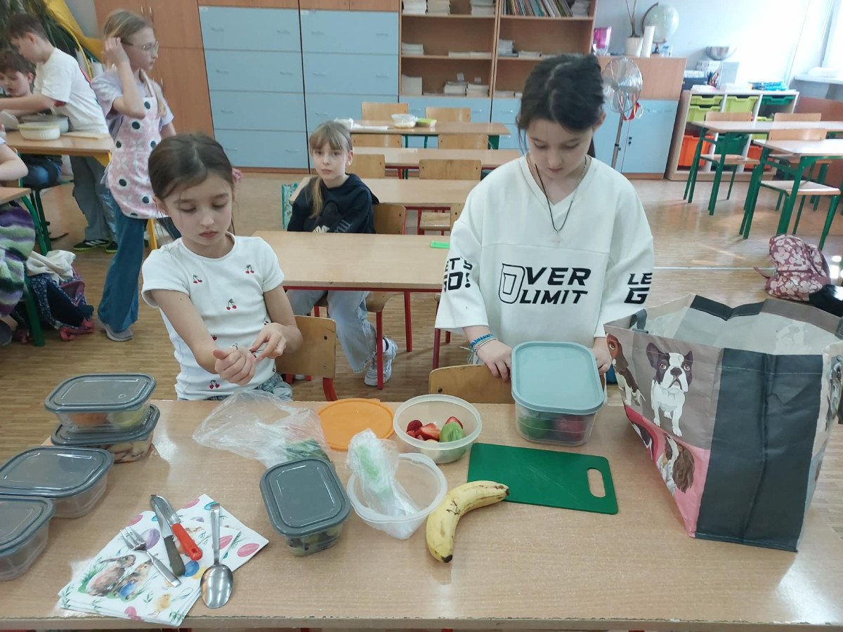Zwieńczeniem zajęć było samodzielne przygotowanie przez dzieci sałatek warzywnych i owocowych. Uczniowie z dużym zaangażowaniem kroili, mieszali i komponowali swoje zdrowe przysmaki.