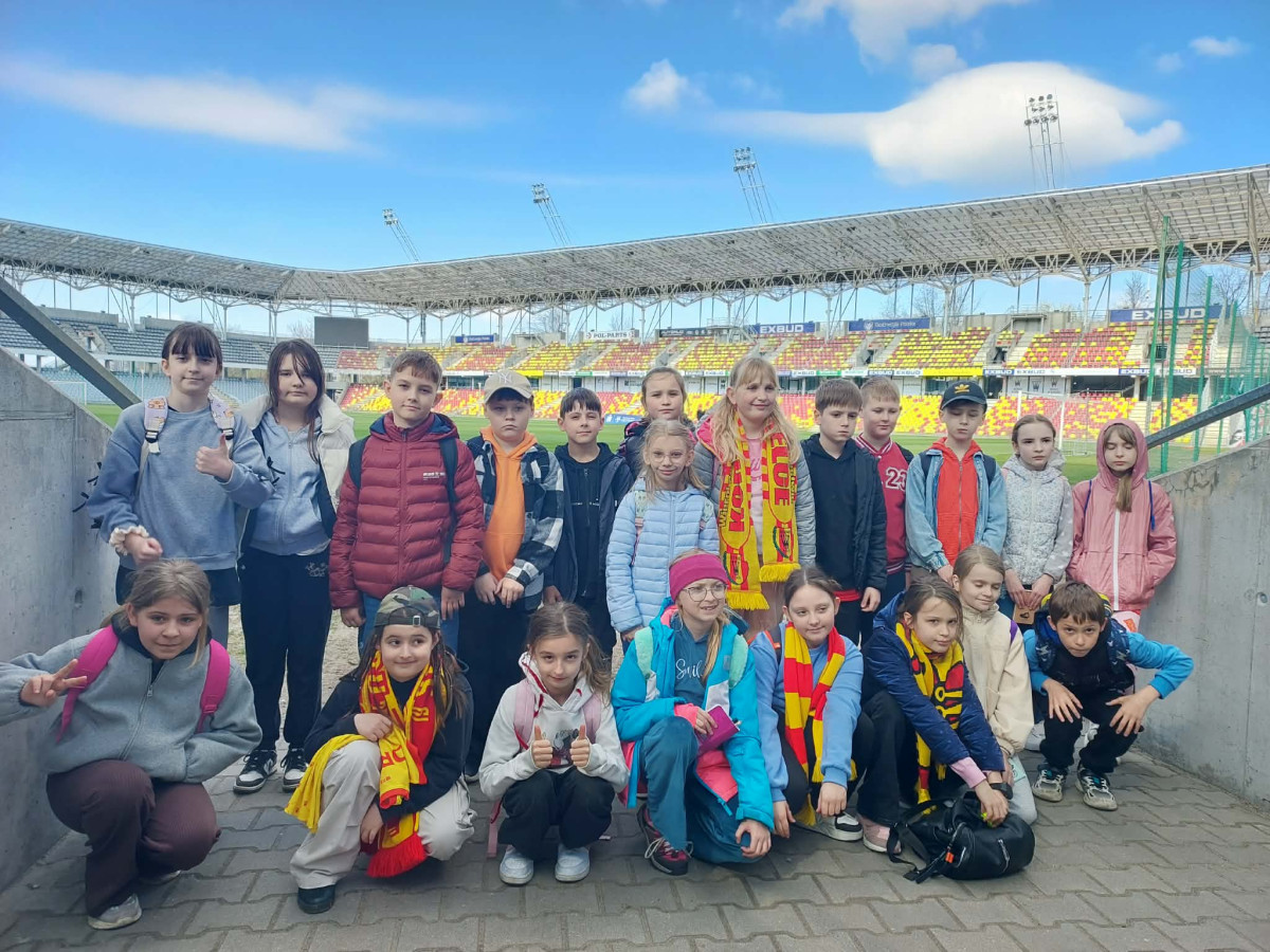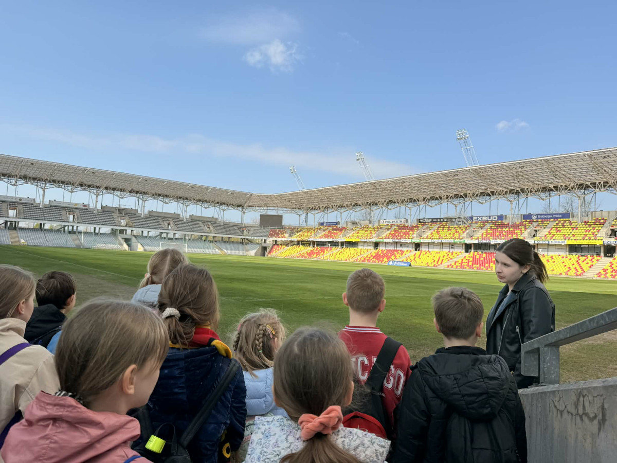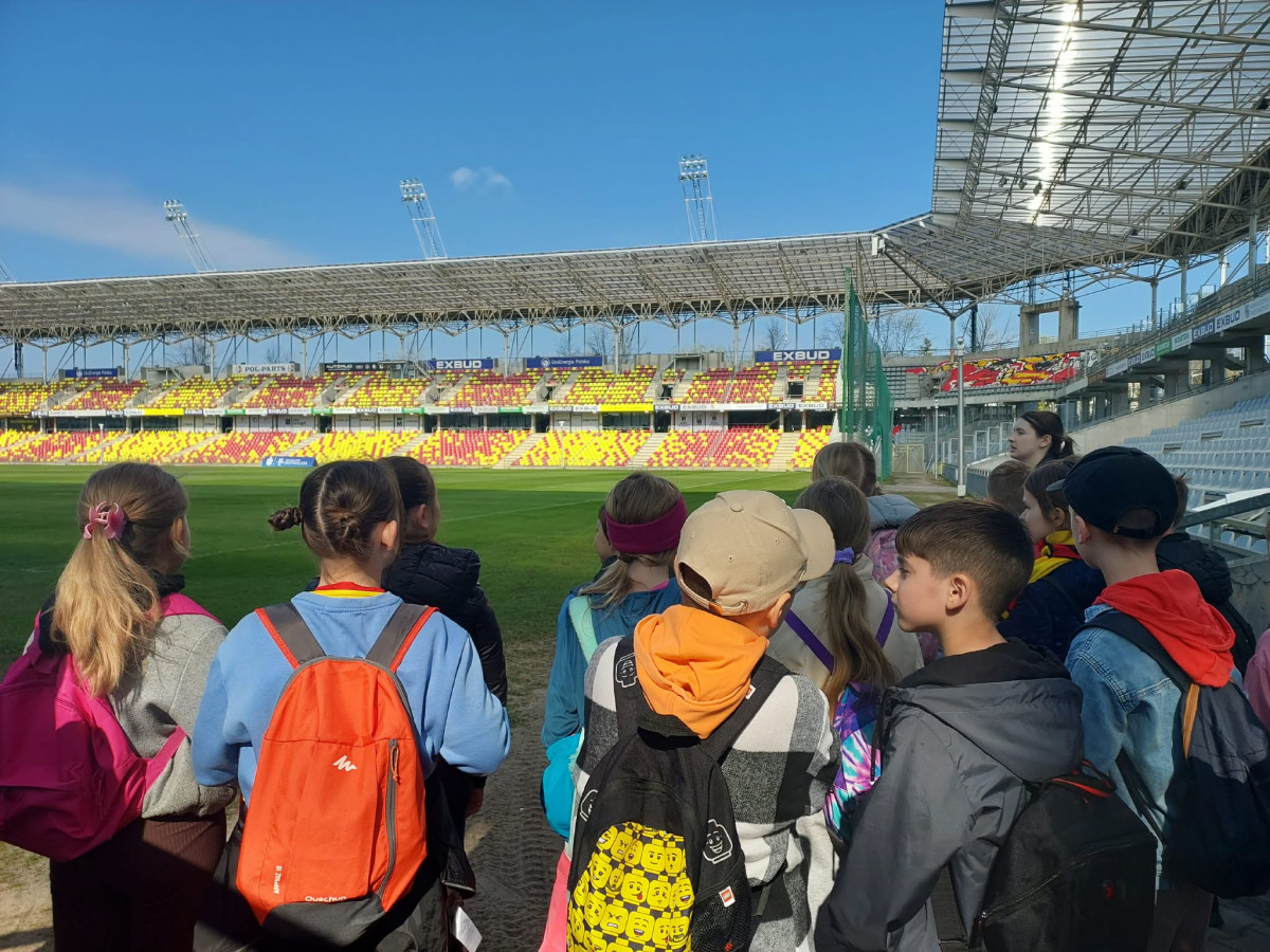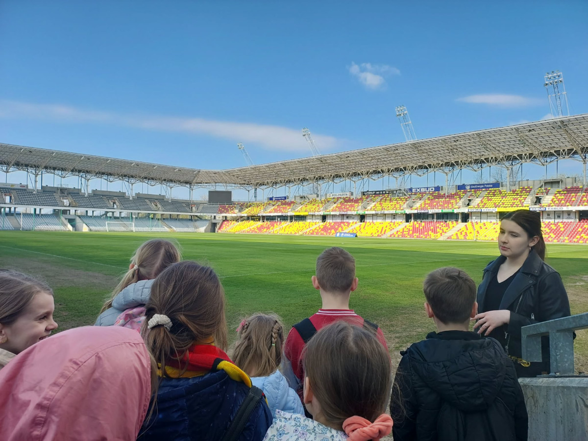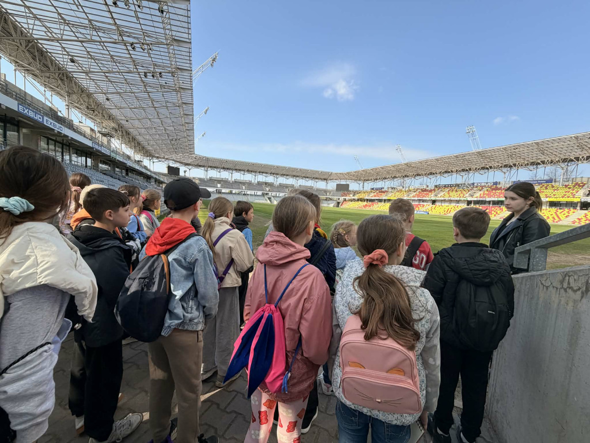 Pierwszym punktem programu był przejazd autobusem miejskim na stadion, gdzie uczniowie uczestniczyli w jego zwiedzaniu. Podczas wizyty zapoznali się z funkcjonowaniem obiektu, poznali zasady przygotowania meczów, organizację pracy drużyny oraz kulisy konferencji prasowych. Była to niezwykle ciekawa lekcja pokazująca, jak wygląda zaplecze wydarzeń sportowych „od kuchni”.
