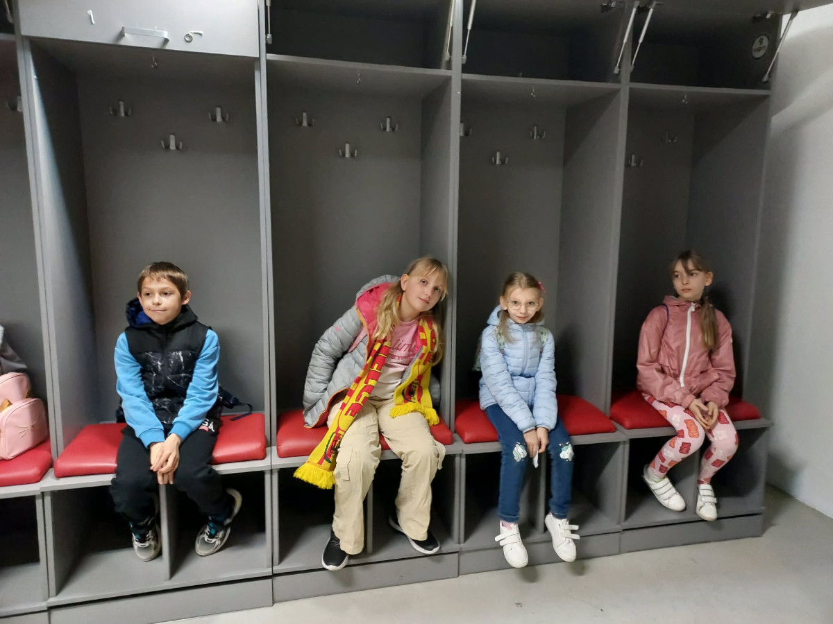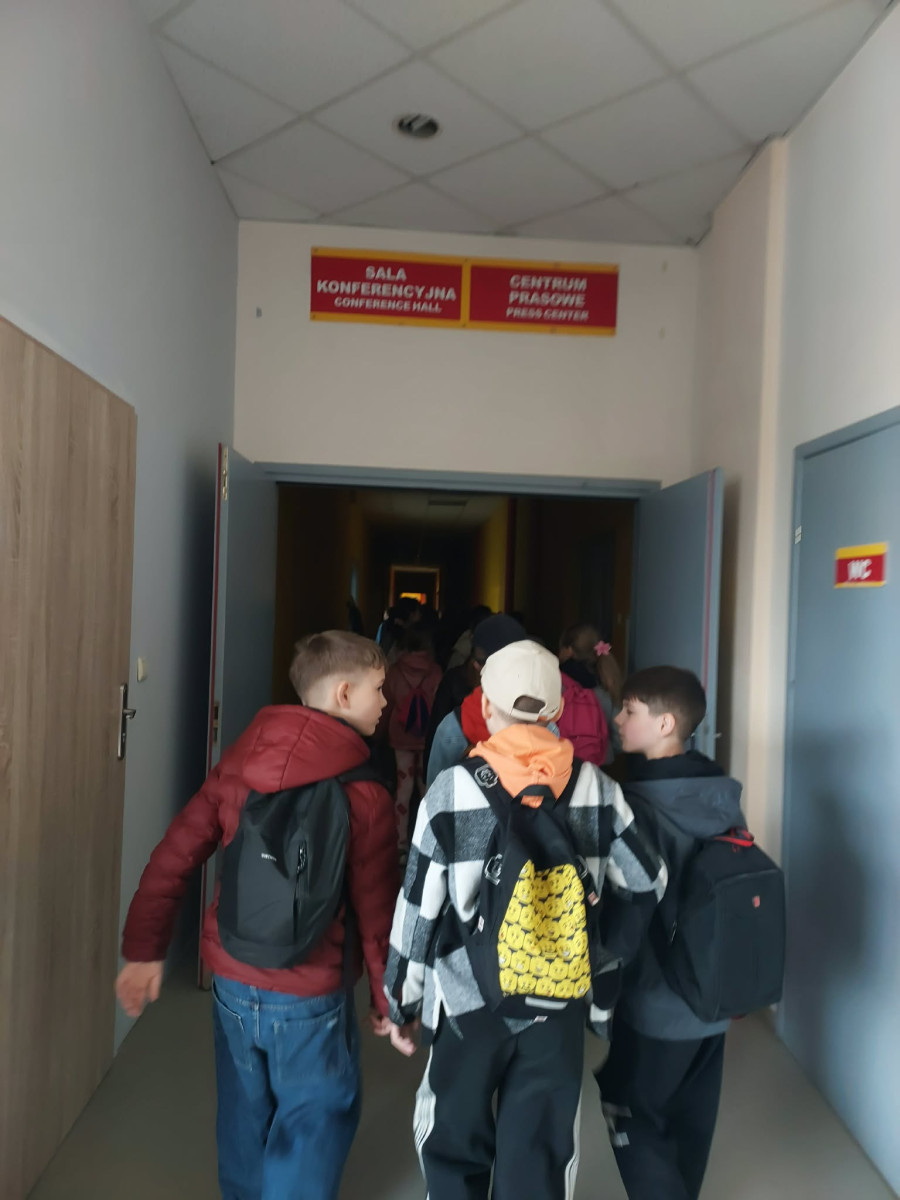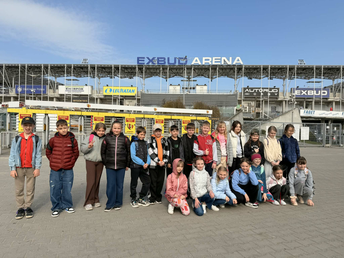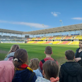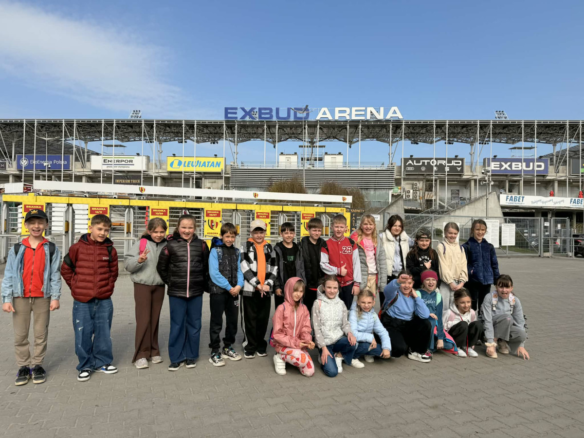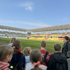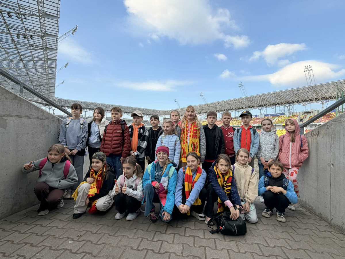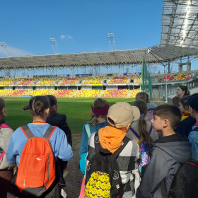 Pierwszym punktem programu był przejazd autobusem miejskim na stadion, gdzie uczniowie uczestniczyli w jego zwiedzaniu. Podczas wizyty zapoznali się z funkcjonowaniem obiektu, poznali zasady przygotowania meczów, organizację pracy drużyny oraz kulisy konferencji prasowych. Była to niezwykle ciekawa lekcja pokazująca, jak wygląda zaplecze wydarzeń sportowych „od kuchni”.