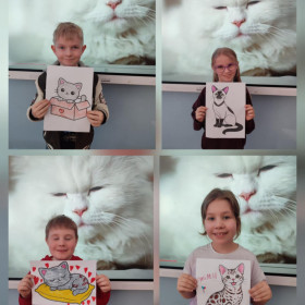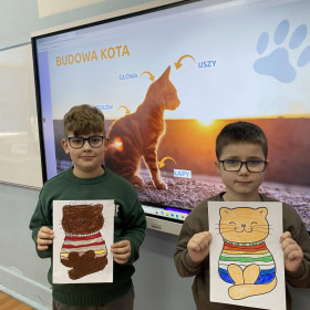 Chętni uczniowie wykonali kocie maski, a każda klasa niepowtarzalne prace plastyczne: