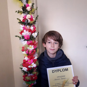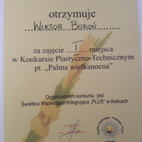 Gratulacje dla Wiktora Boronia z klasy III a, który zajął I miejsce w Konkursie Plastyczno- Technicznym pt. „Palma wielkanocna” organizowanym przez Świetlicę Wspierająco- Integrującą „Plus” w Kielcach.