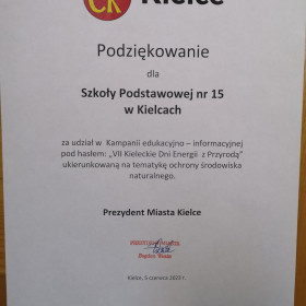 5 czerwca, uczniowie klasy 1a uczestniczyli w kampanii informacyjno - edukacyjnej ukierunkowanej na sprawy związane z poprawą efektywności energetycznej i ochroną powietrza na terenie miasta pod hasłem „VII Kieleckie Dni Energii z Przyrodą”.