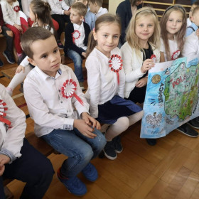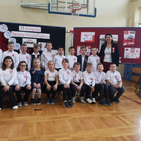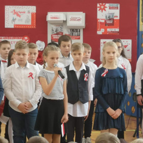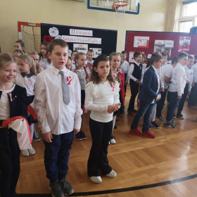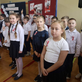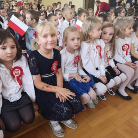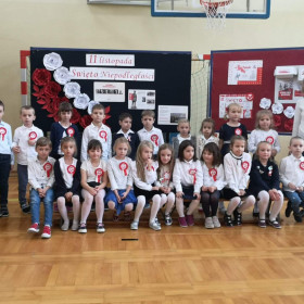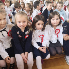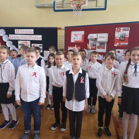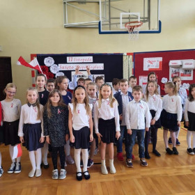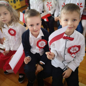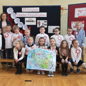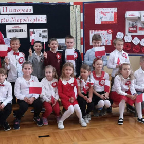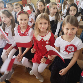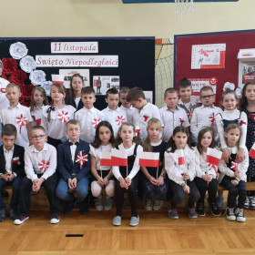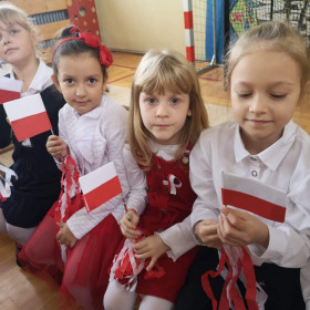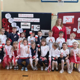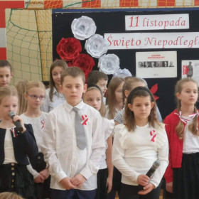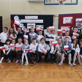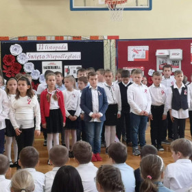 Z okazji Święta Niepodległości, uczniowie klas 3a i 3c przygotowali wraz z wychowawcami krótki montaż słowno-muzyczny. Dzieci odświętnie ubrane prezentowały się wspaniale, przepięknie recytując i śpiewając znane utwory patriotyczne. Występ oglądali wszyscy uczniowie klas najmłodszych wraz z wychowawcami i Panią Dyrektor Elżbietą Rasałą.