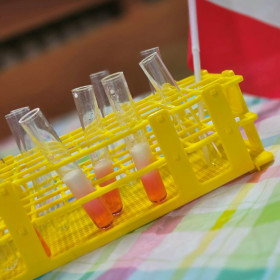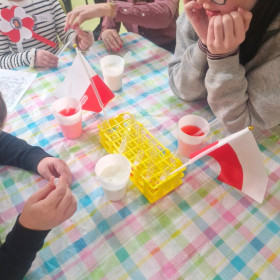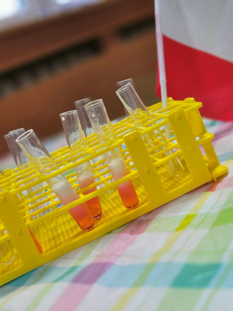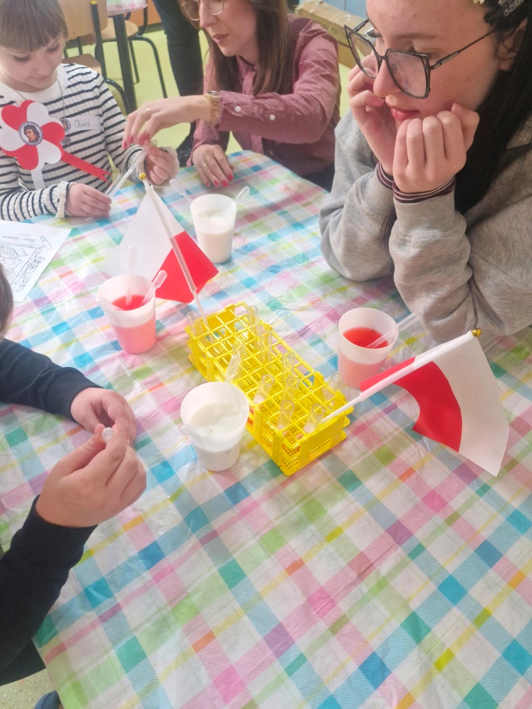 Nie zabrakło także pokazów doświadczeń chemicznych. Szczególną uwagę przyciągała biało-czerwona reakcja chemiczna – symboliczne nawiązanie do patriotycznej postawy patrona naszej szkoły, Tadeusza Kościuszki.