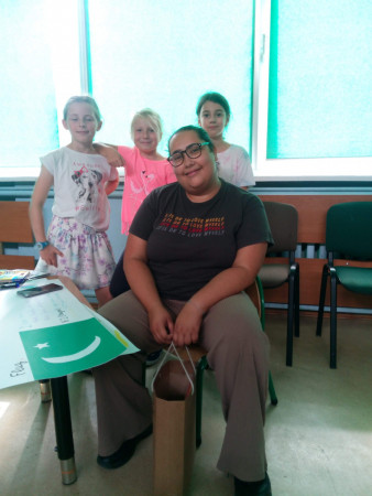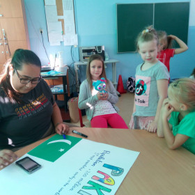 W oczekiwaniu na przybycie nowego wolontariusza przygotowała wraz z dziećmi plakaty na temat Pakistanu, kraju, z którego pochodzi Abbas.