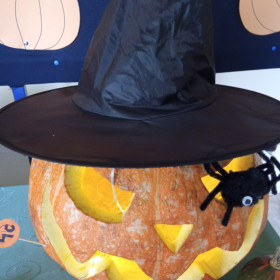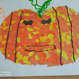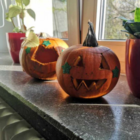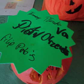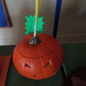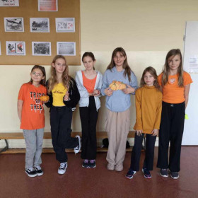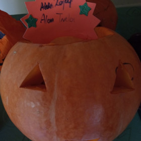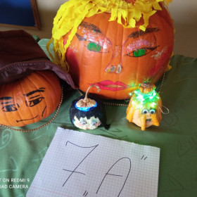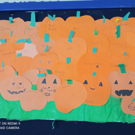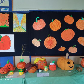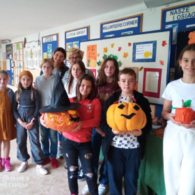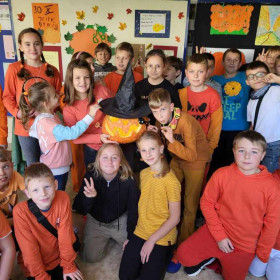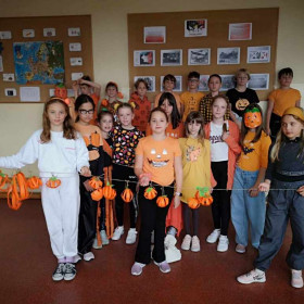 Uczniowie klas 4 - 8 obchodzili 30 października Dzień Dyni. To warzywo występuje najczęściej w kolorze pomarańczowym, więc tego dnia dominował on na szkolnych korytarzach. Klasy wykonały wspólnie ozdobne dynie z papieru albo dyniowe stroiki i lampiony. Pojawiły się także bardzo ciekawe prace indywidualne.