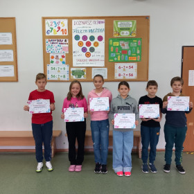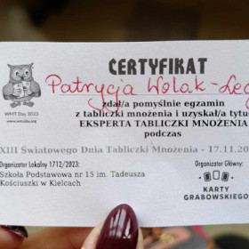 Dodatkowo w czwartek i piątek do zabawy zaprosiliśmy dorosłych - w szkole pojawił się patrol egzaminacyjny, który sprawdzał znajomość tabliczki mnożenia wśród pracowników naszej szkoły. Zadanie nie było takie trudne - dorośli świetnie poradzili sobie z zadaniem i również uzyskali certyfikaty potwierdzające ich umiejętności w tej dziedzinie :)