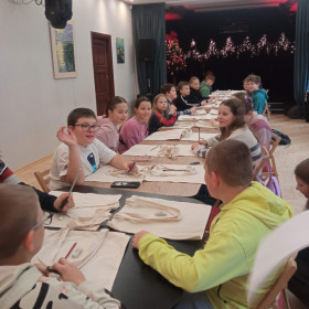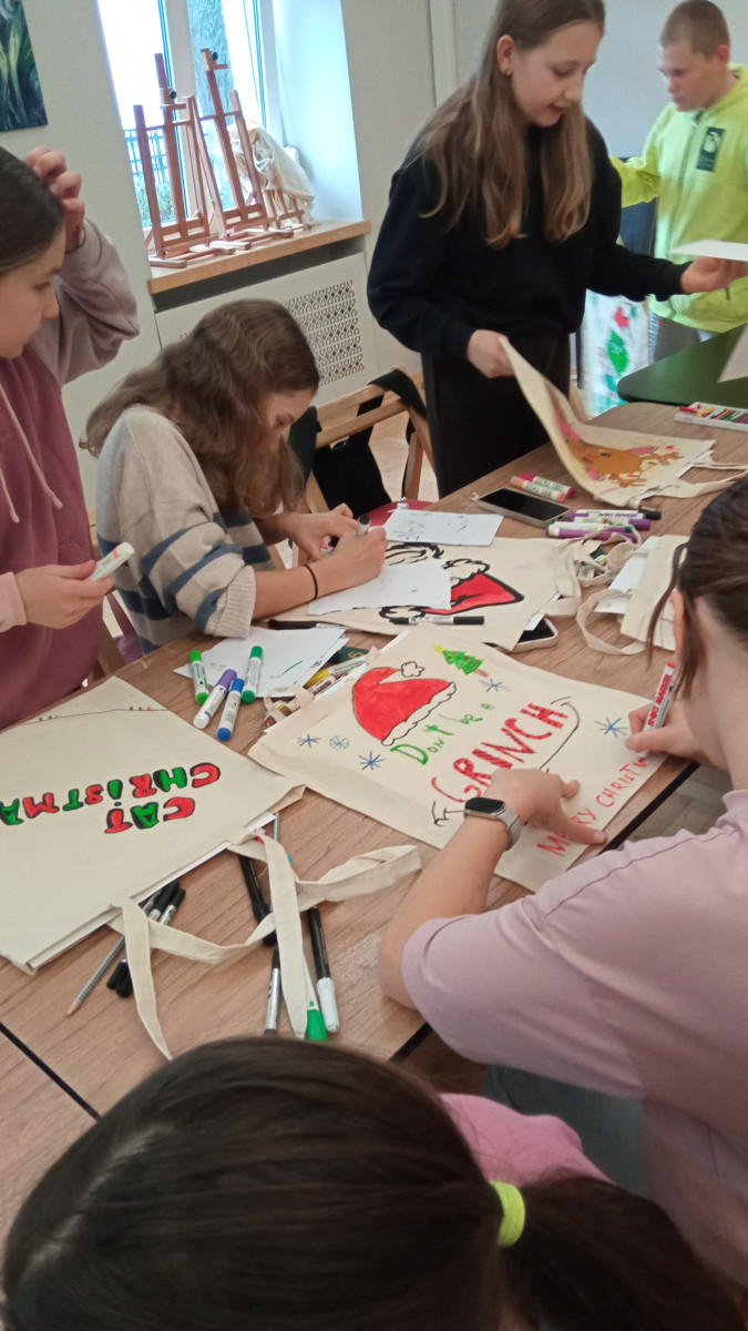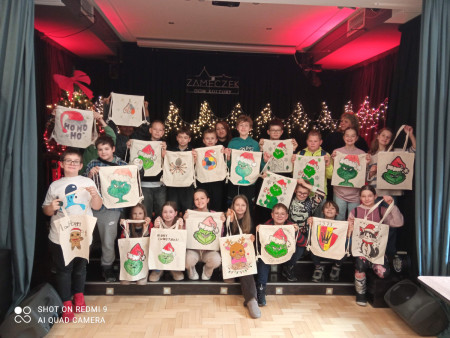 4 grudnia klasa 5b wzięła udział w wyjątkowych warsztatach mikołajkowych zorganizowanych w Domu Kultury „Zameczek". Uczniowie mieli okazję poczuć atmosferę zbliżających się świąt, tworząc własne, niepowtarzalne torby i worki ozdobione motywami bożonarodzeniowymi. Dzięki gotowym szablonom oraz specjalnym pisakom i kredkom do tkanin każdy mógł wykonać świąteczną dekorację według własnego pomysłu. Dzieci wróciły do szkoły z pięknymi pamiątkami, które na pewno przydadzą się nie tylko podczas świątecznych zakupów.