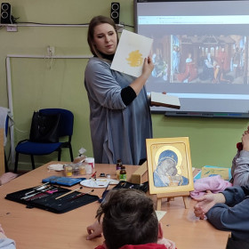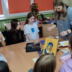 13 grudnia w klasie 7 b odbyły się niezwykłe warsztaty plastyczne. Pani Martyna Wrońska, artystka zajmująca się tworzeniem ikon, opowiedziała uczniom wiele ciekawostek na temat sztuki średniowiecznej oraz odkryła tajemnice powstawania tych – jak się okazuje – bardzo trudnych i czasochłonnych dzieł, jakimi są ikony pisane (bo tak fachowo nazywa się ich tworzenie) według zasad powstałych jeszcze w średniowieczu.