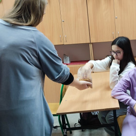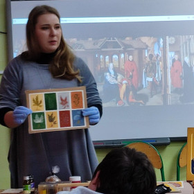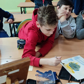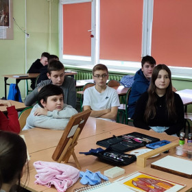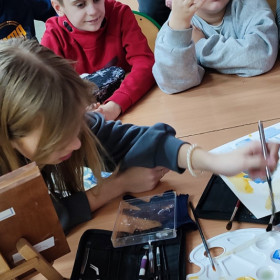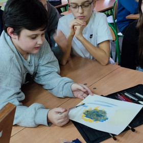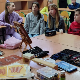 Siódmoklasiści mieli nie tylko okazję obejrzeć wybrane prace malarki, ale próbowali również mieszać farby, aby uzyskać pożądany kolor, a także uczyli się rozróżniać i odpowiednio trzymać pędzelki. Poznali również wszystkie materiały, które pani Martyna wykorzystuje w pracy.