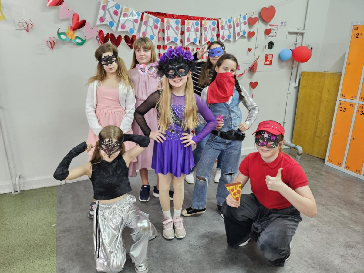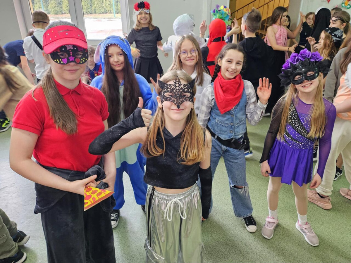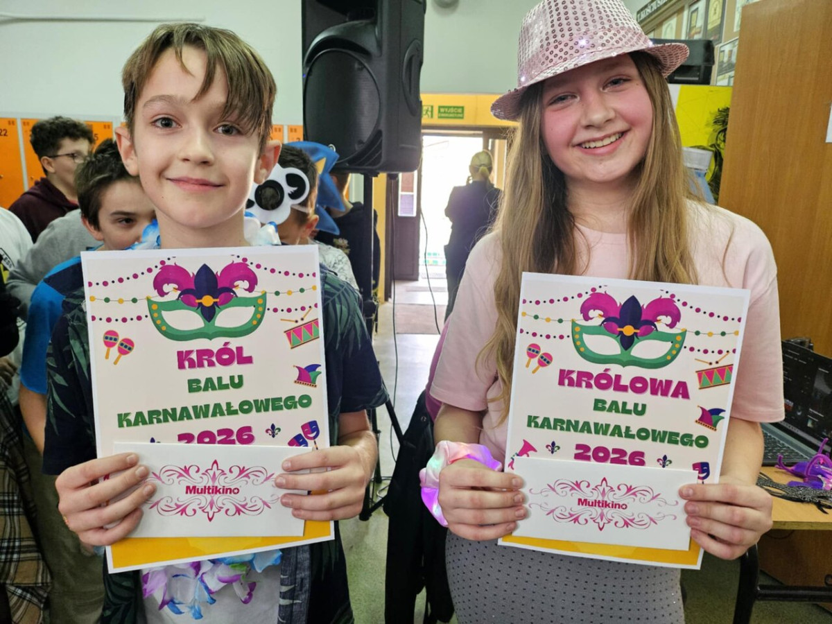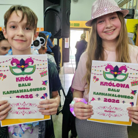 12 lutego 2026 r. Samorząd Uczniowski we współpracy z panią Agnieszką Król zorganizował wyjątkowy bal maskowy dla uczniów klas IV–V. Podczas wydarzenia wybrano Króla i Królową Balu. Jury kierowało się pomysłowością stroju i maski oraz zaangażowaniem w zabawę. Po długich naradach tytuł Królowej Balu zdobyła Hanna Biskupska z klasy 5B, natomiast Królem Balu został Michał Bochnak z klasy 4A. Zwycięzcy otrzymali dyplomy oraz karty upominkowe do kina Multikino (ważne przez rok). Nagrody zostały ufundowane ze środków zebranych podczas kiermaszu świątecznego – dziękujemy wszystkim, którzy przyczynili się do ich organizacji! Całemu wydarzeniu towarzyszył wspaniały humor, taneczne rytmy i największe muzyczne hity.