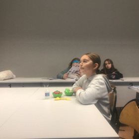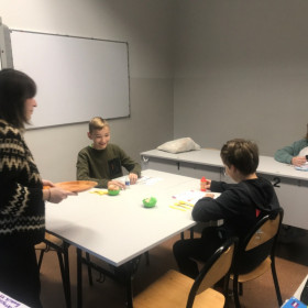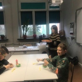 W środę na lekcji języka angielskiego w klasie piątej uczniowie przedstawiali scenki „W restauracji”. Rolę kelnerki odgrywała nasza wolontariuszka z Hiszpanii -  Maria. Uczniowie prosili o stolik dla jednej lub dwóch osób, po zajęciu miejsca prosili o menu (wcześniej przygotowane przez każdego ucznia w formie wyklejanych obrazków z różnymi potrawami). Zamawiali dania, przekąski i napoje. Prosili o rachunek i pytali czy mogą płacić kartą, telefonem czy tylko gotówką. Na stołach znalazły się różne produkty spożywcze. Mamy nadzieję, że takie lekcje ułatwią naszym uczniom zamawianie potrawy podczas podróży po całym świecie.