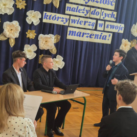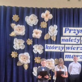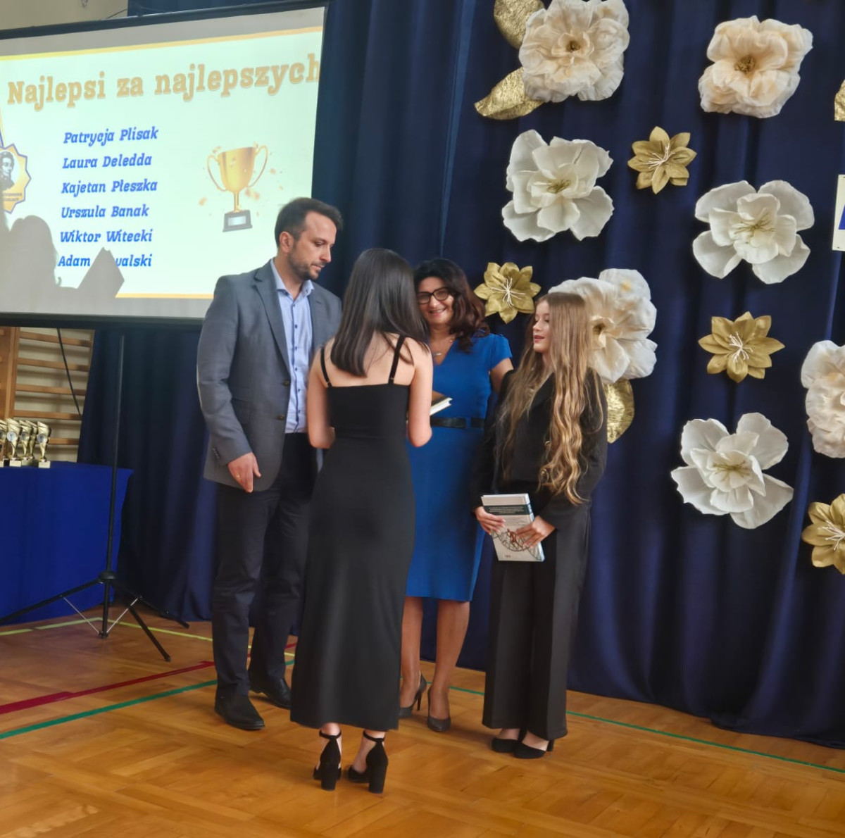 Natomiast wspaniałą dekorację zaprojektowała pani Lucyna Prędka i zrealizowała projekt z pomocą pani Moniki Okrutny i pani Iwony Fatygi – bardzo im za to dziękujemy. Dziękujemy też wszystkim, którzy pomogli nam rozwiązać różne problemy techniczne – pani Iwonie Pedrycz, pani Agnieszce Merwart, panu Przemysławowi Długoszowi, panu Robertowi Cichowskiemu i panu Rafałowi Januchcie.