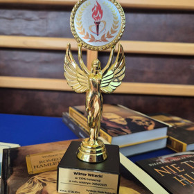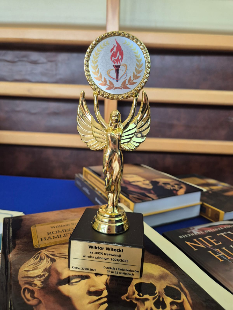 Uczeń, który uzyskał najwyższą średnią w szkole, otrzymał również statuetkę za 100-procentową frekwencję:
