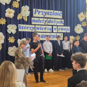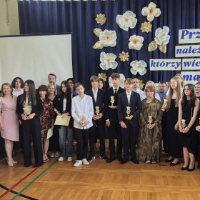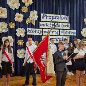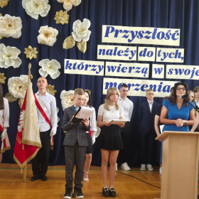 Pamiątkowe statuetki otrzymali również uczniowie z pocztu sztandarowego, dbający o godność i dobre imię szkoły nie tylko podczas ważnych uroczystości, ale także zdobywający nagrody w konkursach pocztów sztandarowych.