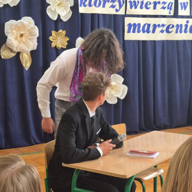 Część artystyczną ósmoklasiści przygotowali pod kierunkiem swoich wychowawczyń, pani Moniki Łodej i pani Martyny Jandały, a scenariusz był trawestacją słynnego dramatu A. Mickiewicza Dziady cz. II. Nie zabrakło wyznania win i przestróg uczniowskich duszyczek, ale przede wszystkim uczniowie podziękowali dyrekcji, wszystkim nauczycielom i pracownikom szkoły za 8 lat wytężonej pracy, wspaniałej zabawy i ciepłej rodzinnej atmosfery, która sprawiała, że dało się rozwiązywać wszystkie problemy, bo przecież także z nich składa się życie.