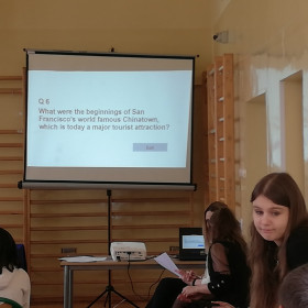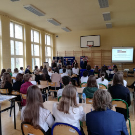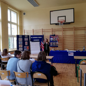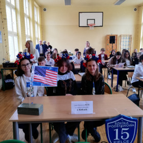 Aleksandra Madej (7b), Natalia Fatyga (7b) oraz Laura Deledda (6b) reprezentowały naszą szkołę w IV Wojewódzkim Konkursie Wiedzy o Kulturze Stanów Zjednoczonych „Focus on the USA”. Zmagania konkursowe trwały od stycznia 2023 roku, kiedy to odbył się I etap. II etap miał miejsce w marcu. Zadaniem uczestników było przeczytać na każdym etapie po 5 artykułów z czasopisma ZOOM IN ON AMERICA dotyczących różnych zagadnień z kultury, historii, sportu, życia codziennego czy transportu w Stanach Zjednoczonych. 19 kwietnia zespół dziewcząt udał się do Zbludowic, gdzie miał miejsce III etap konkursu. Do rywalizacji przystąpiło 19 drużyn z województwa świętokrzyskiego. Nasza drużyna miała pięknie przygotowane stoisko z tarczą szkoły, flagą amerykańską. Dziewczęta miały koszulki z tytułem konkursu zaprojektowane przez jedną z mam, a na głowie opaski z kwiatami w kolorach narodowych Stanów Zjednoczonych wykonane przez dzieci ze świetlicy wraz z nauczycielami. Konkursowi przewodniczyła Pani Dolores Prin - Konsul ds. Prasy i Kultury z Konsulatu Generalnego USA w Krakowie. Opowiadała o swojej niezwykłej pracy, podróżach i zainteresowaniach, odpowiadała na pytania uczestników. Konkurs był na bardzo wysokim poziomie i dostarczył wszystkim uczestnikom mnóstwo pozytywnych emocji, znacznie poszerzając ich wiedzę o tym niezwykłym kraju.