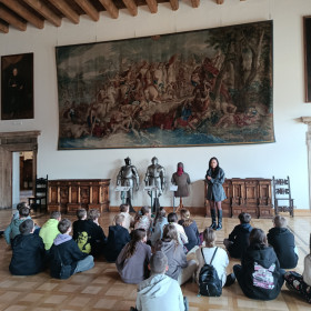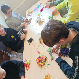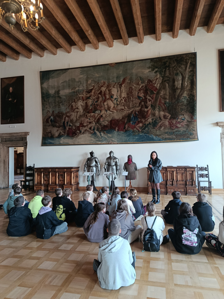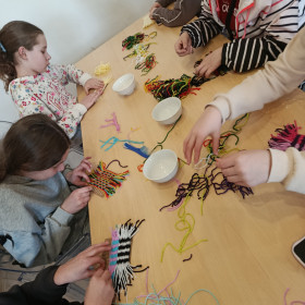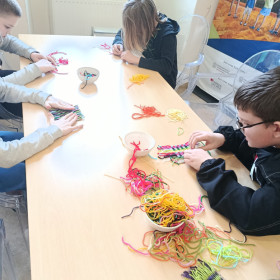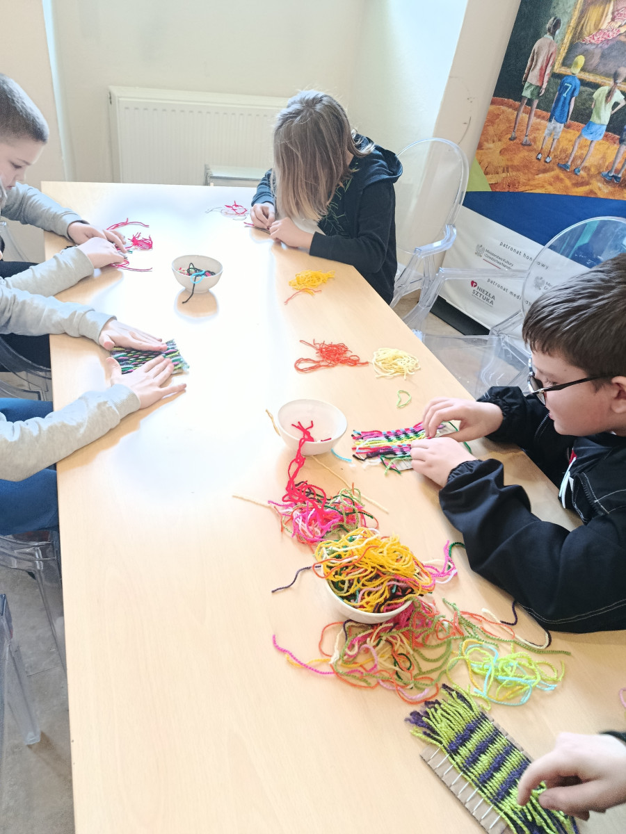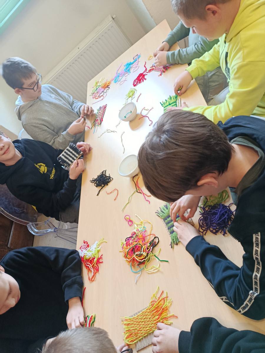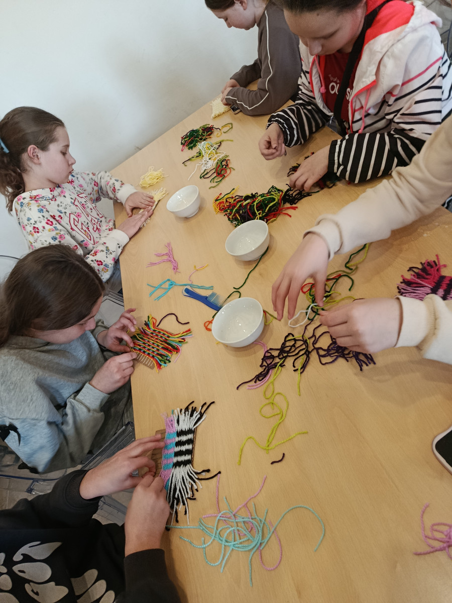 Klasa 5b wybrała się z okazji Dnia Kobiet na warsztaty tkackie do Muzeum Narodowego w Kielcach. Zanim wzięliśmy się do pracy, obejrzeliśmy zabytkowe tapiserie, które znajdują się w muzeum. Potem, zainspirowani widokiem ozdobnych tkanin, sami mogliśmy spróbować swoich sił jako tkacze i tkaczki. Każdy uczestnik warsztatów pracował na prostych krosnach i samodzielnie wykonał kolorową i niepowtarzalną podkładkę pod kubeczek.