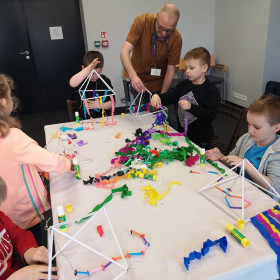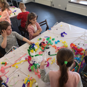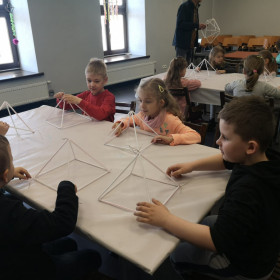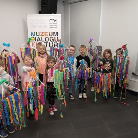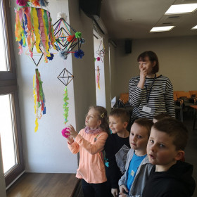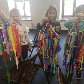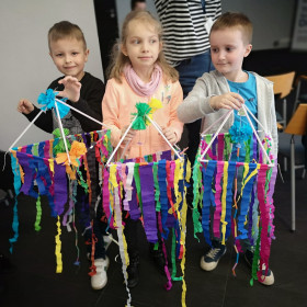 Kultura ludowa okazała się inspiracją do działań twórczych dzieci. Uczestnicy zajęć wykonali barwne pająkowe konstrukcje nawiązujące formą do ludowych pająków jako tradycyjnej formy zdobniczej.