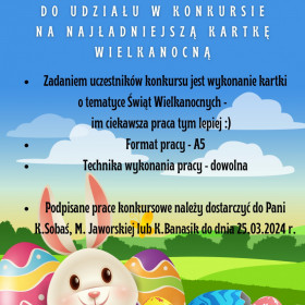Wielkimi krokami zbliżają się Święta Wielkanocne, dlatego serdecznie zapraszamy wszystkich uczniów klas 0 - III do udziału w konkursie na "Najpiękniejszą Kartkę Wielkanocną". Szczegóły zawarte są na plakacie poniżej.