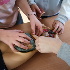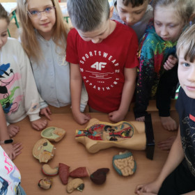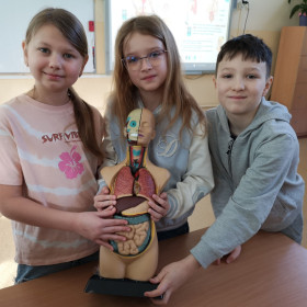 Zajęcia zaczęły się od projekcji mini wykładu, w którym pani Karolina Białobrzewska wprowadziła klasę w tematykę dnia. Po filmie, uczniowie rozmawiali i zadawali pytania, na które szukali odpowiedzi z różnych źródeł informacji. Ponadto pracowali na fantomie edukacyjnym, który dopełnił rozmowę o szkielecie człowieka.