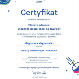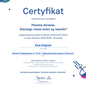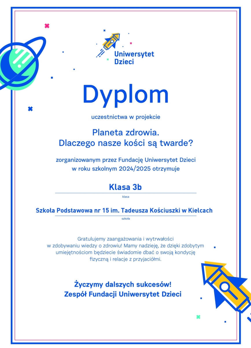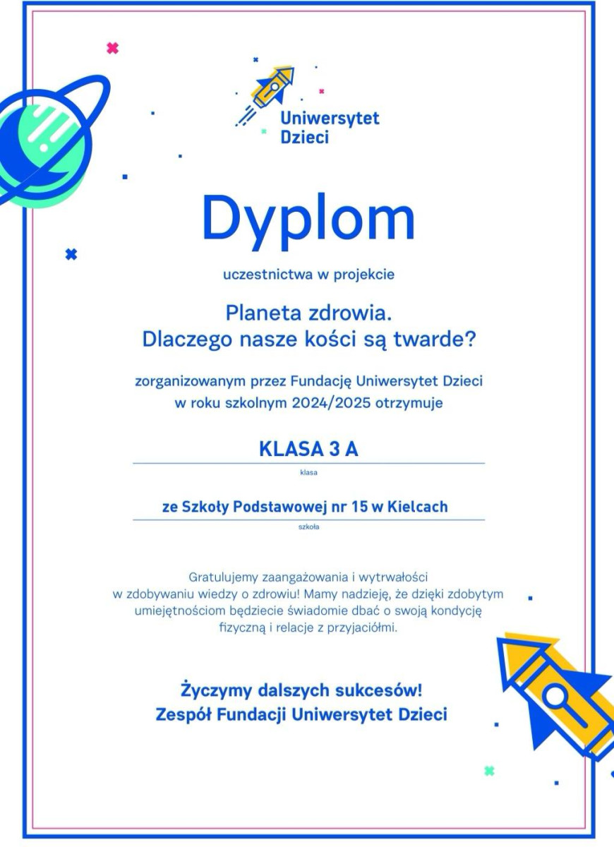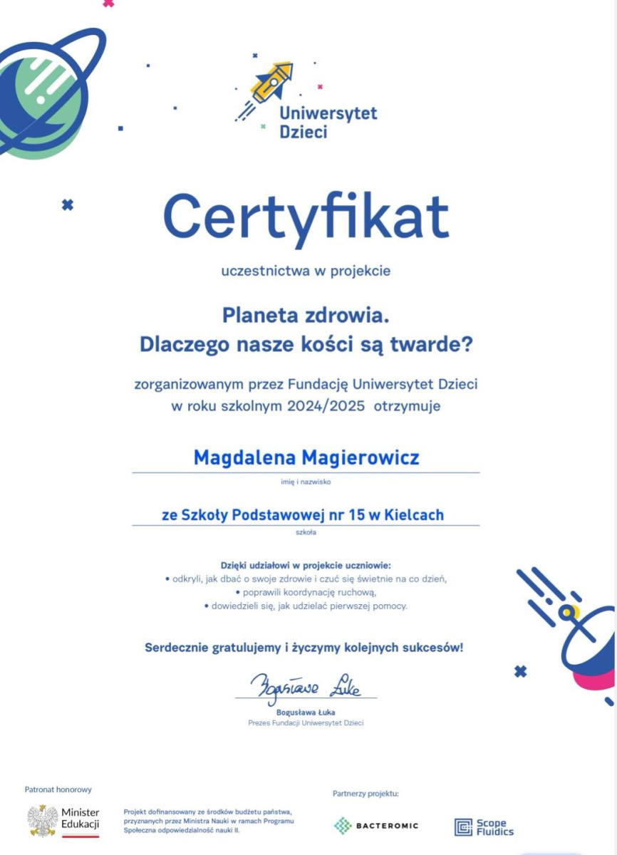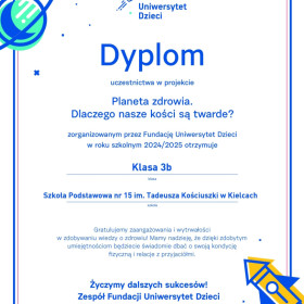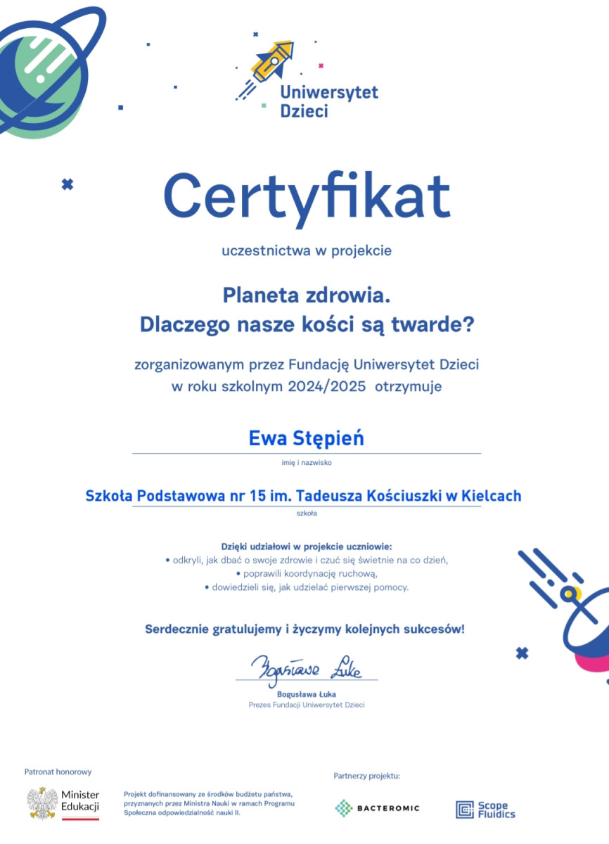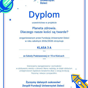 Klasa 3a zakończyła realizację projektu Uniwersytetu Dzieci pt. "Planeta zdrowia. Dlaczego nasze kości są twarde?"