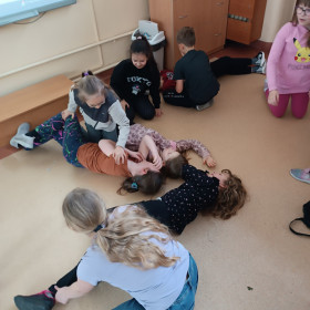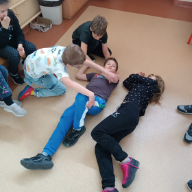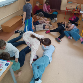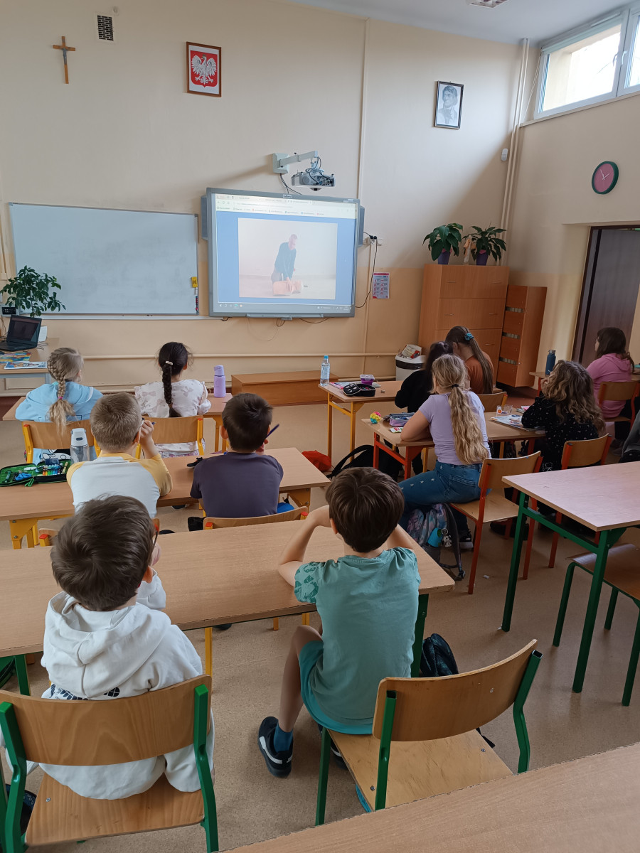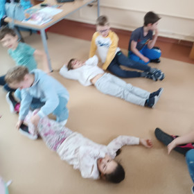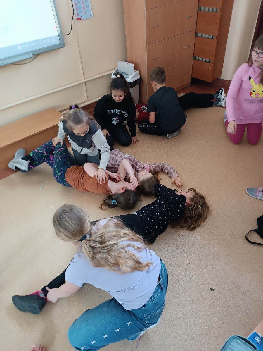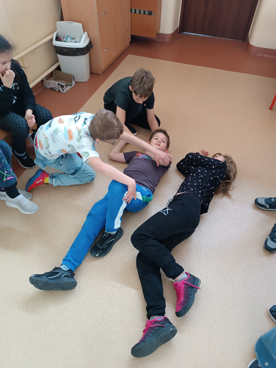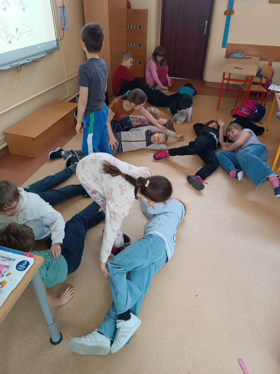 Także w klasie 3 b zakończono realizację projektu Uniwersytet Dzieci: Planeta Zdrowia - Dlaczego nasze kości są twarde? Ostatni temat, który został omówiony związany był z udzielaniem pierwszej pomocy "Jak udzielić pierwszej pomocy?". W trakcie zajęć uczniowie obejrzeli film z mini wykładem, filmy instruktażowe, prezentację multimedialną, a także samodzielnie układali poszkodowanego w pozycji bocznej bezpiecznej.
