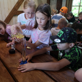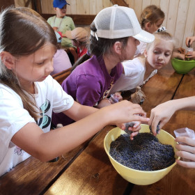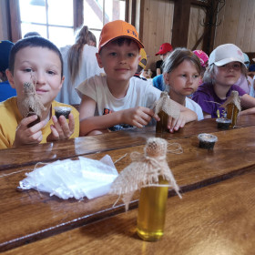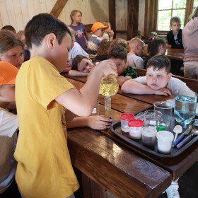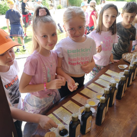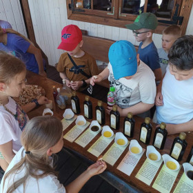 Kolejnym ciekawym doświadczeniem była degustacja naturalnych olejów. Uczniowie poznali smaki między innymi oleju słonecznikowego, lnianego, rydzowego, rzepakowego, z pestek dyni, z czarnuszki czy też z maku. Spróbowali również przepysznych miodów. Ciekawym doświadczeniem było młócenie cepem. Następnym etapem wycieczki były warsztaty prowadzone przez pracownice Ligi Ochrony Przyrody z Kielc. Uczniowie wykonywali eksperymenty z wodą i olejem wykorzystując do tego sprzęt laboratoryjny oraz różne składniki. Wykonali także samodzielnie olejki do masażu oraz woreczki z suszoną lawendą. Uczniowie wrócili zmęczeni, ale bardzo zadowoleni z wyjazdu