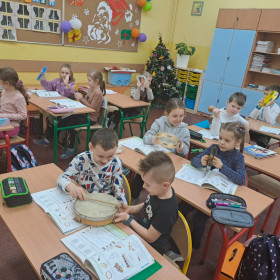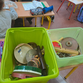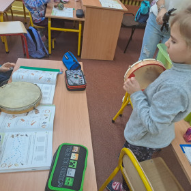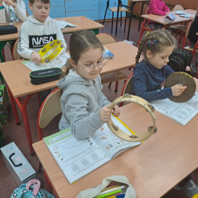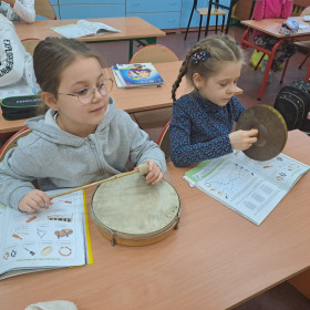 Klasa 1b w czasie zajęć poznawała instrumenty perkusyjne. Dzieci mogły dotknąć instrumentów i sprawdzić jakie wydają dźwięki. Dzieci z zainteresowaniem i radością poznawały wszystkie instrumenty. To była ciekawa lekcja!