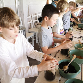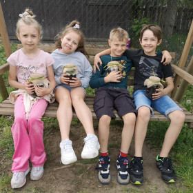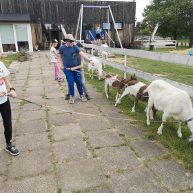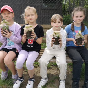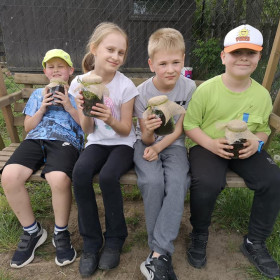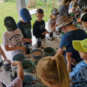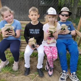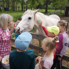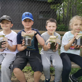 Podczas wizyty w zagrodzie uczniowie nauczyli się jak dbać o zwierzęta, poznali tradycje i kulturę regionu, aktywnie i ciekawie spędzili czas. W czasie zwiedzania zagrody mogli obcować z takimi zwierzętami jak kozy, owce, kuce szetlandzkie, konie, kury, czy króliki. Ponadto odwiedzili kurnik, królikarnię, stodołę i spiżarnię. Utrwalili wiadomości o zbożach i pracach polowych. Uczniowie uczestniczyli także w bardzo ciekawych warsztatach pt.: “Las w słoiku”. Dzieci wykonały unikalne kompozycje według instrukcji. Słoik z lasem to zamknięty w szkle mały ekosystem, który rośnie, zmienia się oraz pięknie wygląda. Każdego dnia można zaobserwować zmiany jakie w środku zachodzą. Podczas warsztatów był również czas, aby porozmawiać o właściwej pielęgnacji „Lasu w słoiku”. Mamy nadzieję, że powstałe piękne kompozycje długo będą pamiątką z wycieczki drugoklasistów. Kolejnym punktem naszej wyprawy był poczęstunek w klimatycznej altanie na świeżym powietrzu. Na zakończenie wszyscy udali się na plac zabaw lub zajęli się wyprowadzaniem kóz, owieczek lub królików na "spacer".