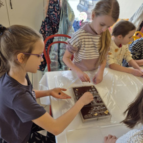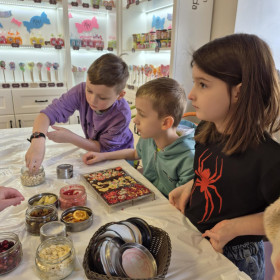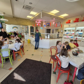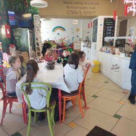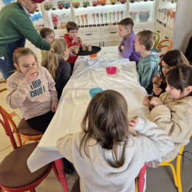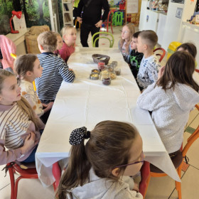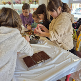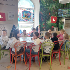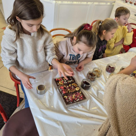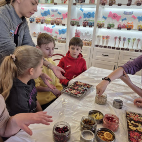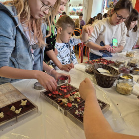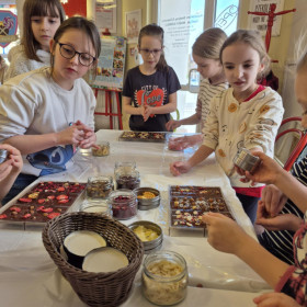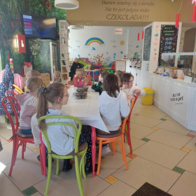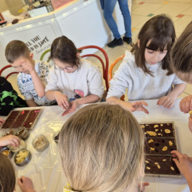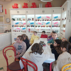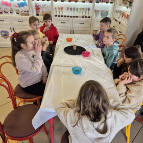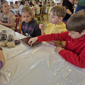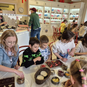W dniu 18.03.2025 uczniowie kasy 2 a wybrali się na czekoladowe, edukacyjne warsztaty „Od ziarna do tabliczki”, przygotowane przez Manufakturę „Magia karmelu” w Kielcach. Warsztaty „Od ziarna do tabliczki” to wspaniałe połączenie edukacji i zabawy. Dzieci dowiedziały się skąd pochodzi i jak smakuje prawdziwe ziarno kakaowca, gdzie rosną i w jaki sposób są zbierane jego ziarna , jak pracuje się w manufakturze oraz kim tak naprawdę jest cukiernik. Spróbowali jak smakują prawdziwe ziarna kakaowca i gorąca czekolada, dowiedzieli się skąd się wzięło powiedzenie „Zatkało kakao” i dlaczego dawniej czekoladę sprzedawano w aptekach. Zwieńczeniem warsztatów było wykonanie i zaprojektowanie własnej, 100g tabliczki czekolady z dodatkami.