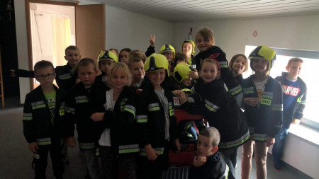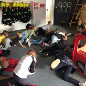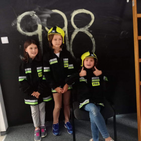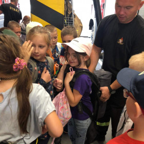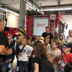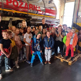 Dnia 14 września uczniowie klas II b w ramach projektu edukacyjnego Razem dla bezpieczeństwa w powiecie kieleckim odwiedziły siedzibę Państwowej Straży Pożarnej w Kielcach. Zajęcia odbywały się w sali edukacyjnej Ognik. Ich celem było przyswojenie przez uczniów praktycznych zachowań w niebezpiecznych sytuacjach, które mogą się zdarzyć w różnych miejscach. Podczas spotkania strażacy przedstawili tematykę z zakresu bezpiecznej ewakuacji z zadymionych pomieszczeń, sposoby powiadamiania służ ratunkowych. Pracownica straży przekazała uczniom zasady prawidłowego zachowania się w sytuacji zagrożenia zdrowia i życia. Słuchając pogadanki i oglądając krótkie filmiki dzieci uczyły się, jak uniknąć pożaru, jak bezpiecznie korzystać z urządzeń elektrycznych, co zrobić, gdy zapali się na dziecku ubranie oraz jak zachować się, gdy w sąsiednim pomieszczeniu pojawi się pożar. Na zakończenie spotkania dzieci zadawały strażakom pytania, przymierzały strażackie ubrania i hełm. Na zakończenie spotkania w Straży Pożarnej uczniowie obejrzeli różnego rodzaju wozy strażackie oraz nowoczesny sprzęt gaśniczy. Podczas spotkania uczniowie uzyskali cenną wiedzę dotyczącą niebezpiecznej i odpowiedzialnej pracy straży pożarnej oraz zasady bezpiecznych zachowań podczas zagrożenia.