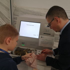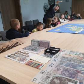 Podczas wizyty w banku uczniowie wymienili monety na bilony, ciężkie torby z groszówkami zostały zastąpione lekkim papierowym pieniądzem.