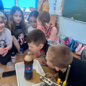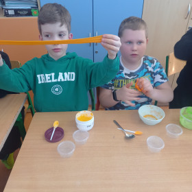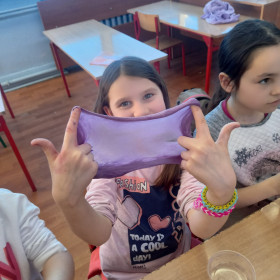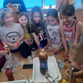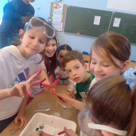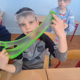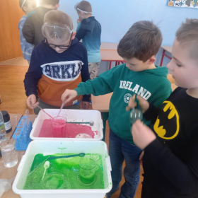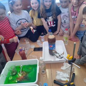 w niezwykłej lekcji chemii. Chociaż nauka tego przedmiotu dopiero przed nimi, to już teraz uczniowie mogli wykonywać ciekawe doświadczenia- sporządzali roztwory, stworzyli sztuczny wulkan oraz kolorowy slimey. Dzieci poznały podstawowe wyposażenie pracowni chemicznej, dowiedziały się do czego służą statywy i szkło laboratoryjne. Dzieci miały okazję wykonać doświadczenia, eksperymenty- uczyć się metodą poglądowości (konkretności). Zgodnie z zasadą Konfucjusza, który kiedyś powiedział: „Słyszałem i zapomniałem, widziałem i zapamiętałem, zrobiłem i zrozumiałem”. Dziękujemy Pani Marzenko za wspaniałą i niezapomnianą lekcję!