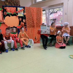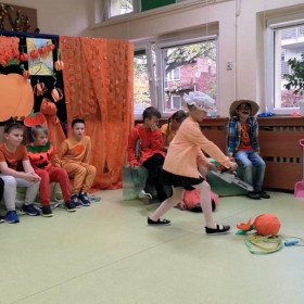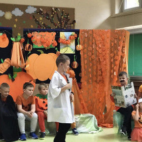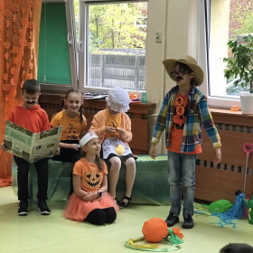 Z okazji Dnia Dyni świetliczaki z klasy 2a zaprosiły swoich kolegów na inscenizację pt. "Dynia".