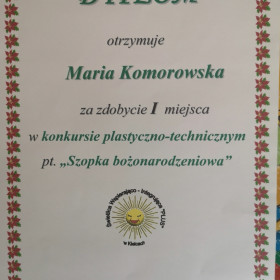 W Międzyszkolnym Konkursie Plastyczno-Technicznym pt. "Szopka bożonarodzeniowa", którego organizatorem była Świetlica Wspierająco- Integrująca "Plus w Kielcach, uczniowie Maria Komorowska i Jakub Szyszka z kl. 2a zajęli I miejsce.