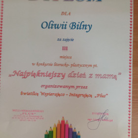 Oliwia Bilny z kl. 6 b wzięła udział w konkursie literackim na wiersz o mamie. Konkurs pod hasłem: "Najpiękniejszy dzień z mamą" został zorganizowany przez Świetlicę Wspierająco - Integrującą "Plus". Uczennica naszej szkoły zajęła w nim III miejsce.