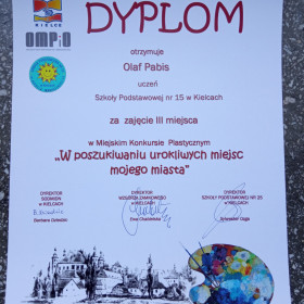 Olaf Pabis, który jest uczniem klasy 4 a, zdobył III miejsce w kategorii kl. IV - V w Miejskim Konkursie Plastycznym "W poszukiwaniu urokliwych miejsc mojego miasta", który zorganizowała Szkoła Podstawowa nr 25 w Kielcach. Na konkurs napłynęły aż 122 prace z 17 szkół podstawowych w Kielcach.