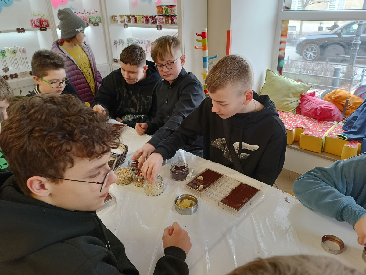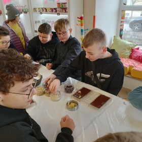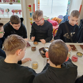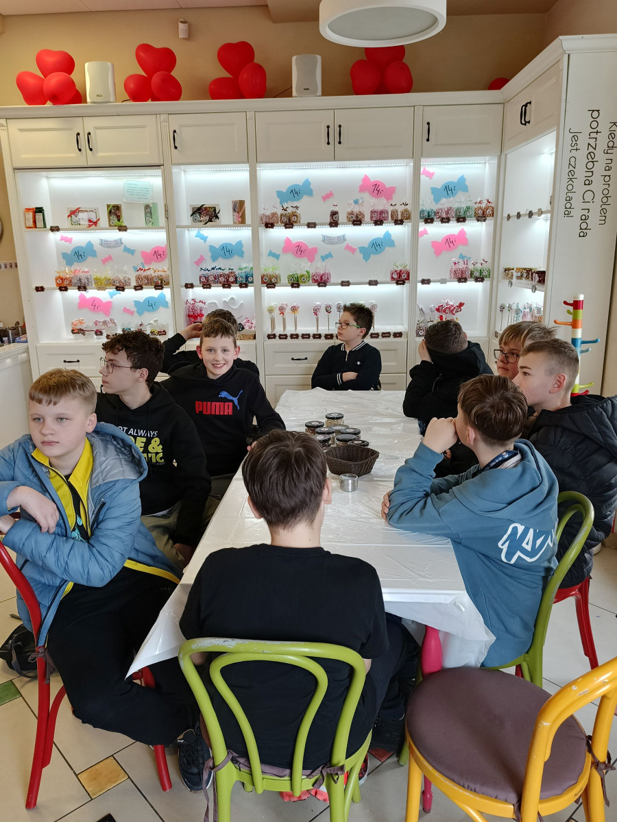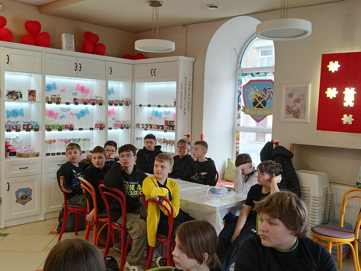 7 marca 2025 r. z okazji zbliżającego się Dnia Kobiet uczniowie klasy 6b udali się do Manufaktury Słodyczy „Magia Karmelu” na warsztaty czekoladowe „Od ziarna do tabliczki”.