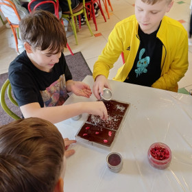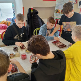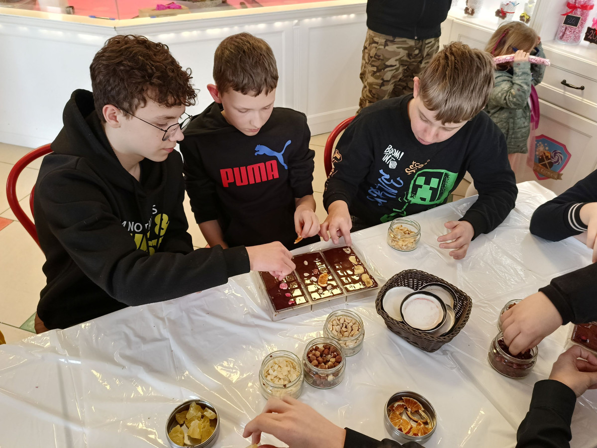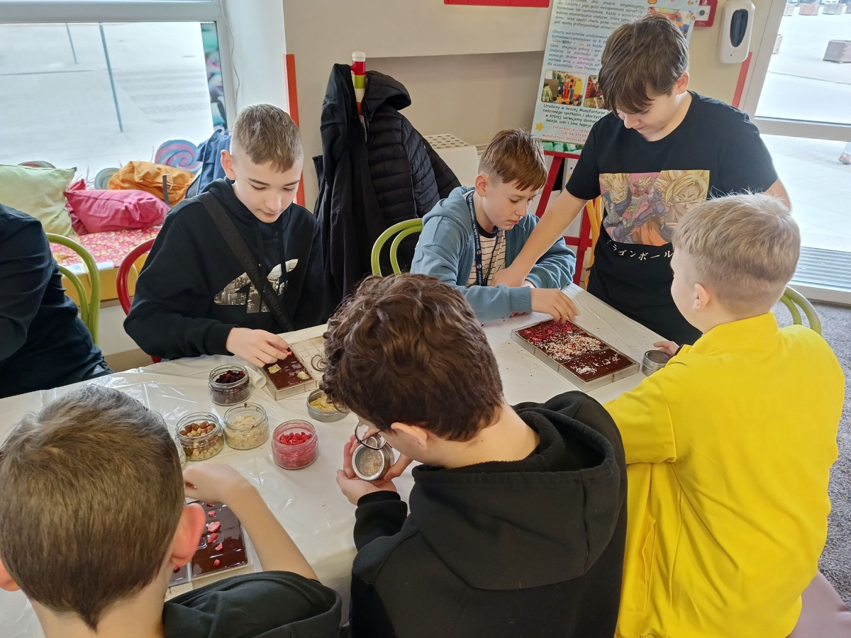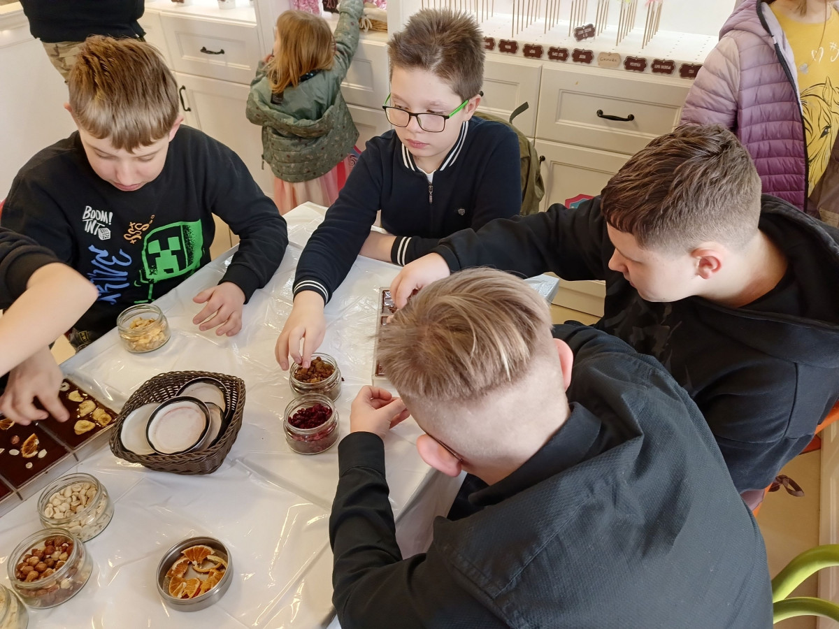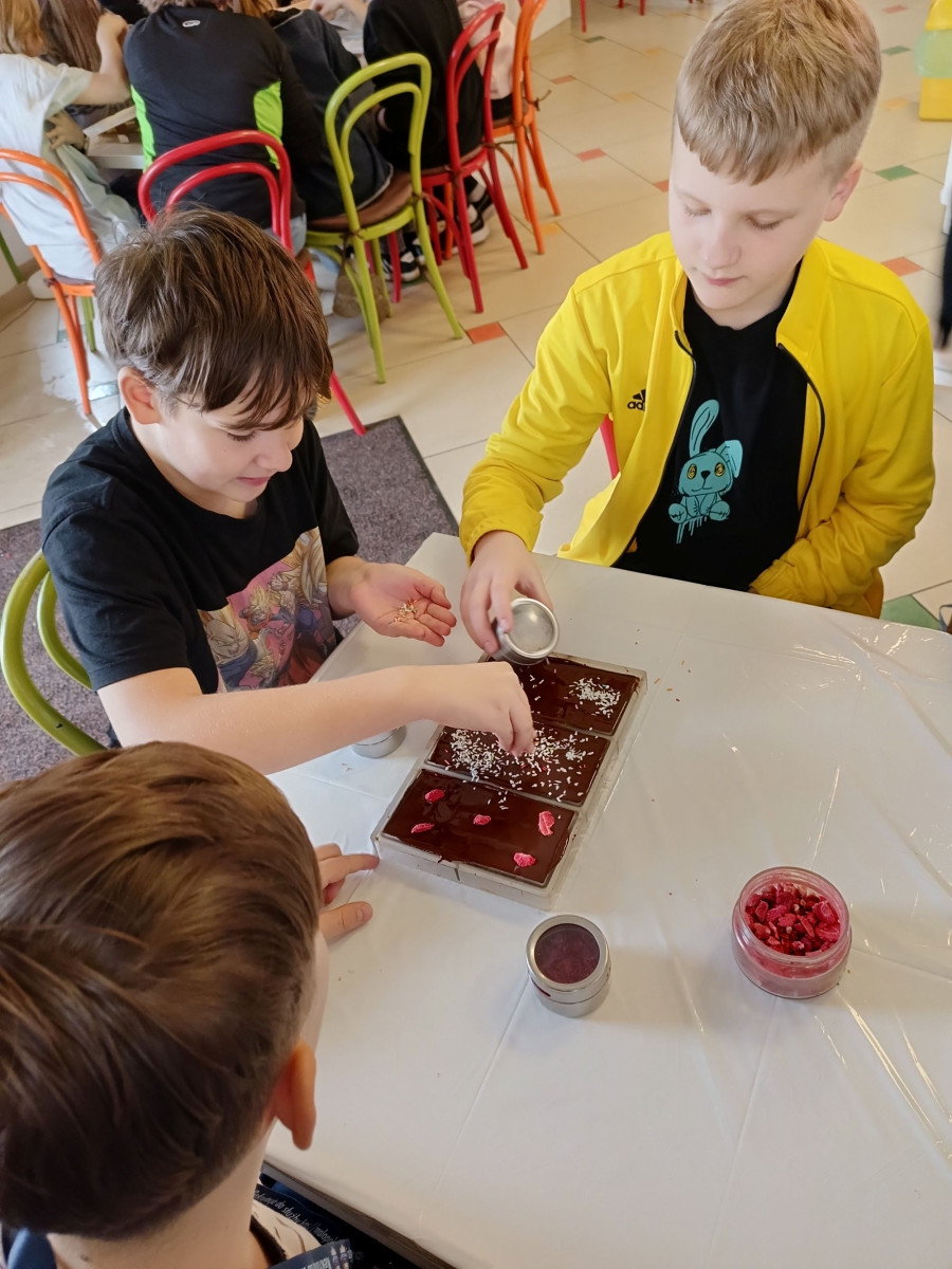 Podczas zajęć dowiedzieli się skąd pochodzi i jak smakuje prawdziwe ziarno kakaowca, spróbowali oryginalnej czekolady do picia oraz zaprojektowali i wykonali własną 100g tabliczkę czekolady z dodatkami. Wraz z samodzielnie wykonaną czekoladą szóstoklasiści zdobyli dyplom młodego czekoladnika.