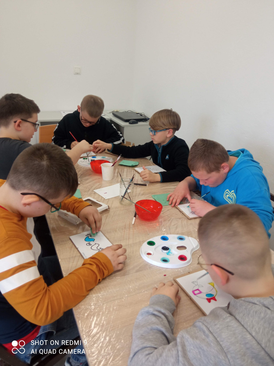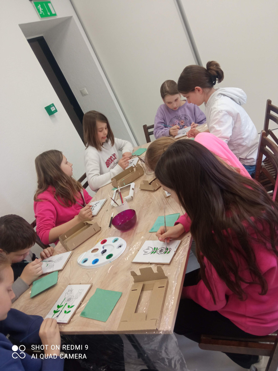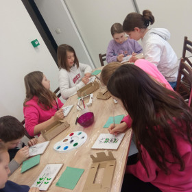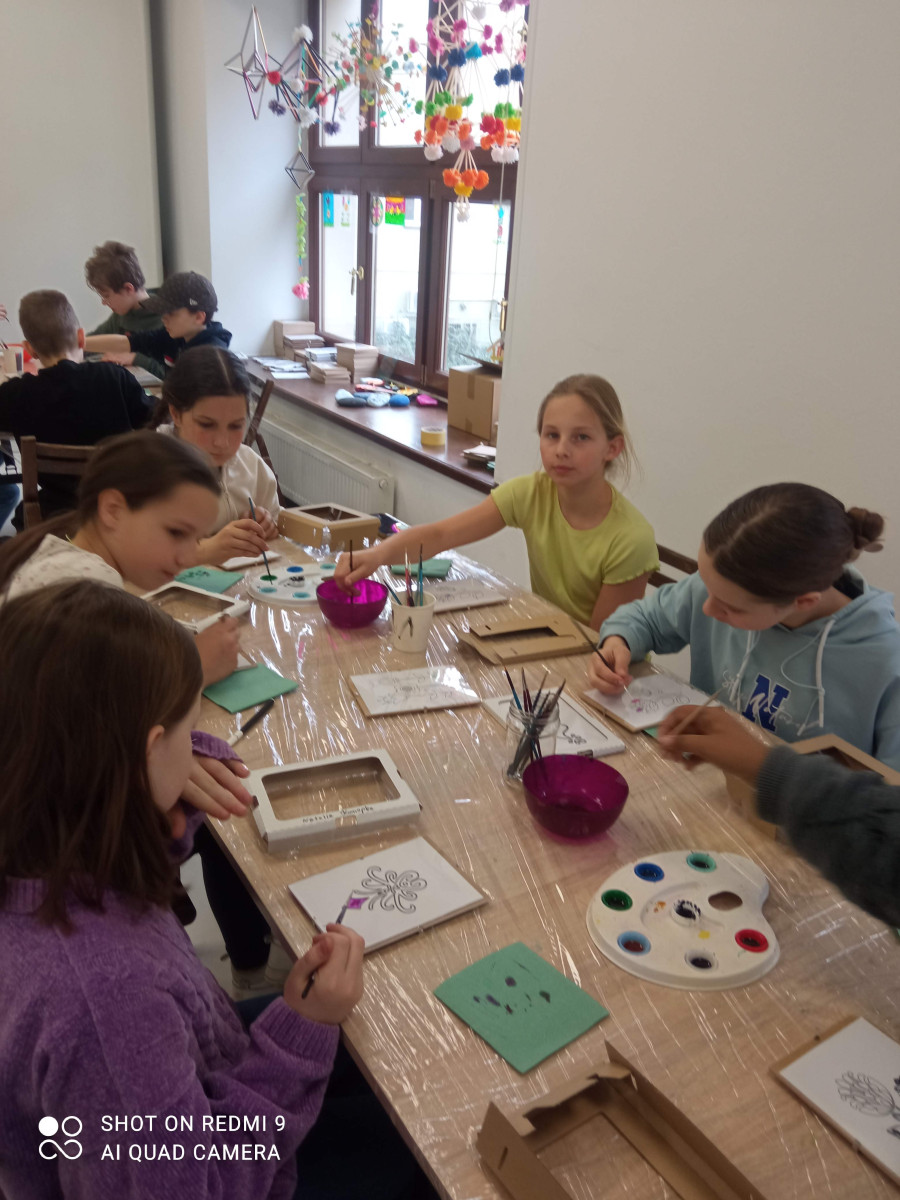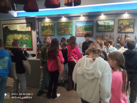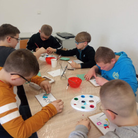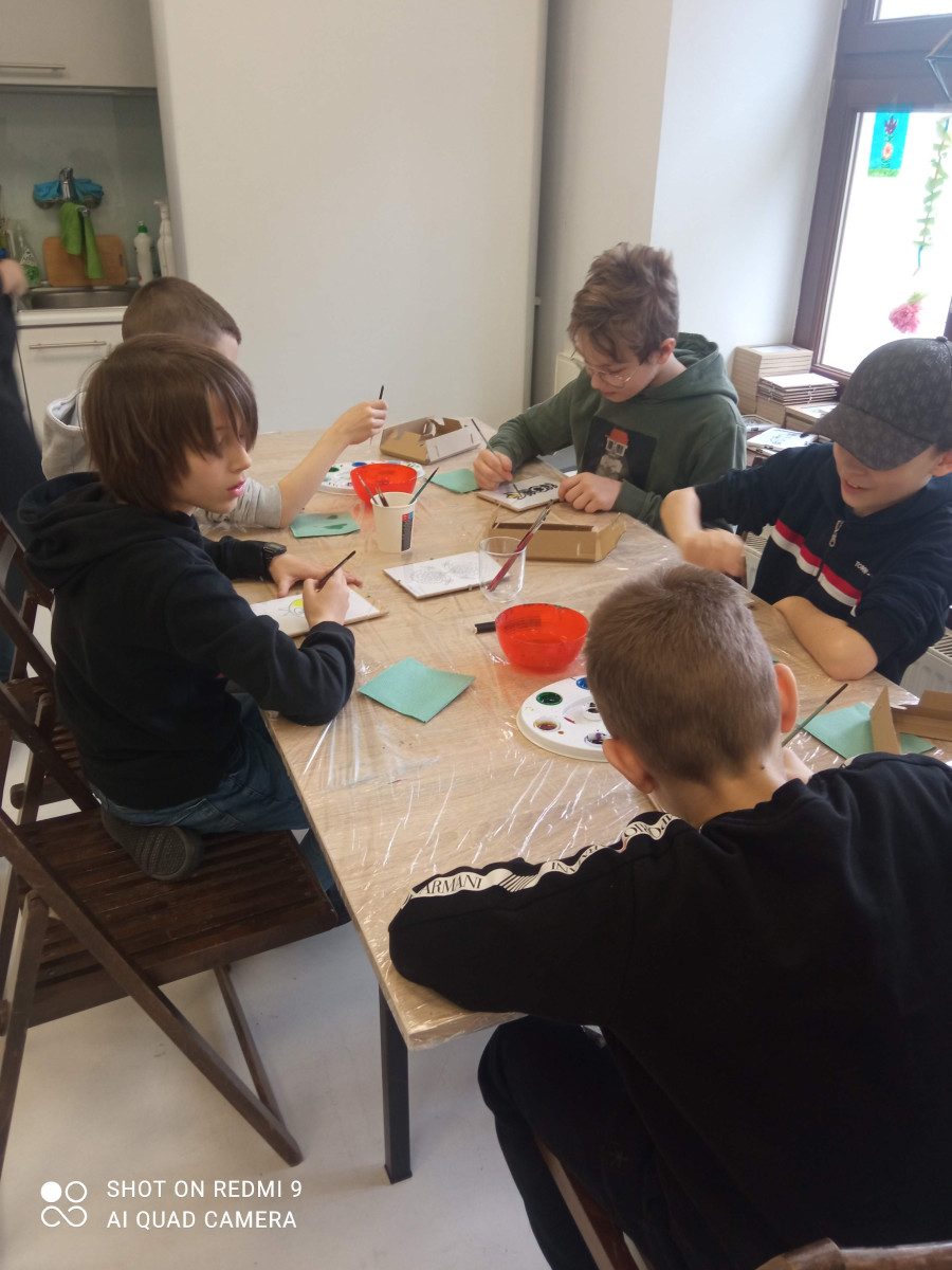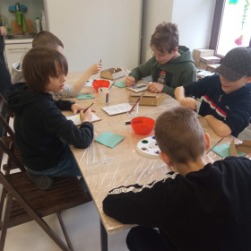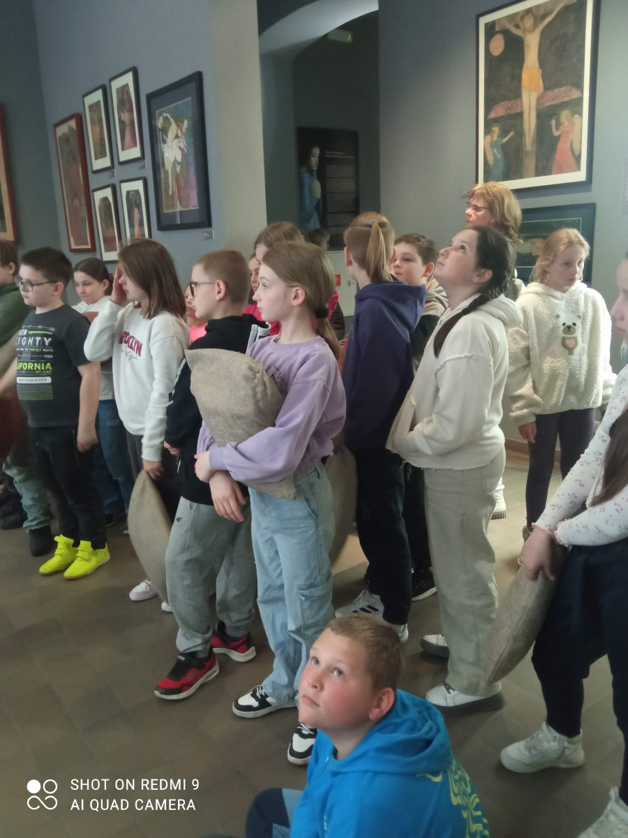 Klasa 4b wybrała się w czwartek do Muzeum Dialogu Kultur. Uczniowie zwiedzili wystawę "Od sacrum do profanum. Rzeźba i malarstwo w sztuce ludowej". Obejrzeli tam m.in. prace artystów ludowych z naszego regionu, poznali realia życia mieszkańców wsi w XIX w. oraz dowiedzieli się, jak kiedyś obchodzono Wielkanoc. Podczas zwiedzania wystawy uczniowie zapoznali się z typowymi dla sztuki ludowej motywami oraz kolorystyką, co pozwoliło im potem na wykonanie własnego obrazu na szkle inspirowanego obejrzanymi wzorami. Każdy mógł wybrać motyw zdobniczy, który najbardziej mu się spodobał, a potem stworzyć swój niepowtarzalny obrazek.