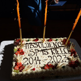 Cudowną niespodziankę dla wszystkich zgromadzonych na uroczystości przygotowali wspaniali rodzice naszych uczniów. Na salę w świetle fajerwerków "wjechał" piękny tort upamiętniający absolwentów Szkoły Podstawowej nr 15 rocznika 2022/2023.