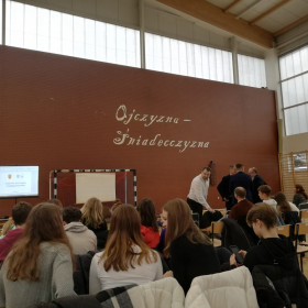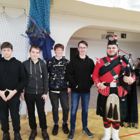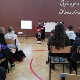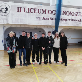 "Dwujęzyczne Kielce" to tytuł projektu realizowanego przez Prezydenta Kielc p.Bogdana Wentę. 25 listopada w II Liceum Ogólnokształcącym im. Jana Śniadeckiego odbyło się spotkanie w ramach tego projektu, na które zostali zaproszeni nasi uczniowie klas ósmych wraz z opiekunem. Podczas tego wydarzenia uczestnicy spotkali się z uczniami i studentami, którzy spędzili swoje dzieciństwo w krajach anglojęzycznych w USA, Wielkiej Brytanii oraz Korei Południowej. Dowiedzieli się o różnicach w systemach edukacji w poszczególnych krajach, posłuchali wymowy brytyjskiej i amerykańskiej. Poszerzyli swoją wiedzę na temat języka angielskiego - australijskiego. Spotkanie umilił występ Patryka Pawluczaka grającego na dudach szkockich oraz wokalne występy młodzieży (oczywiście w języku angielskim).