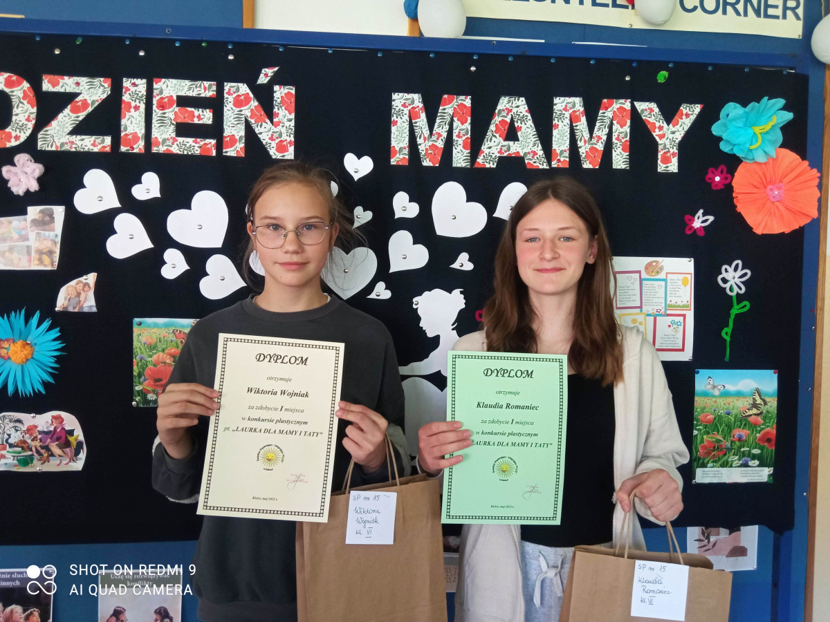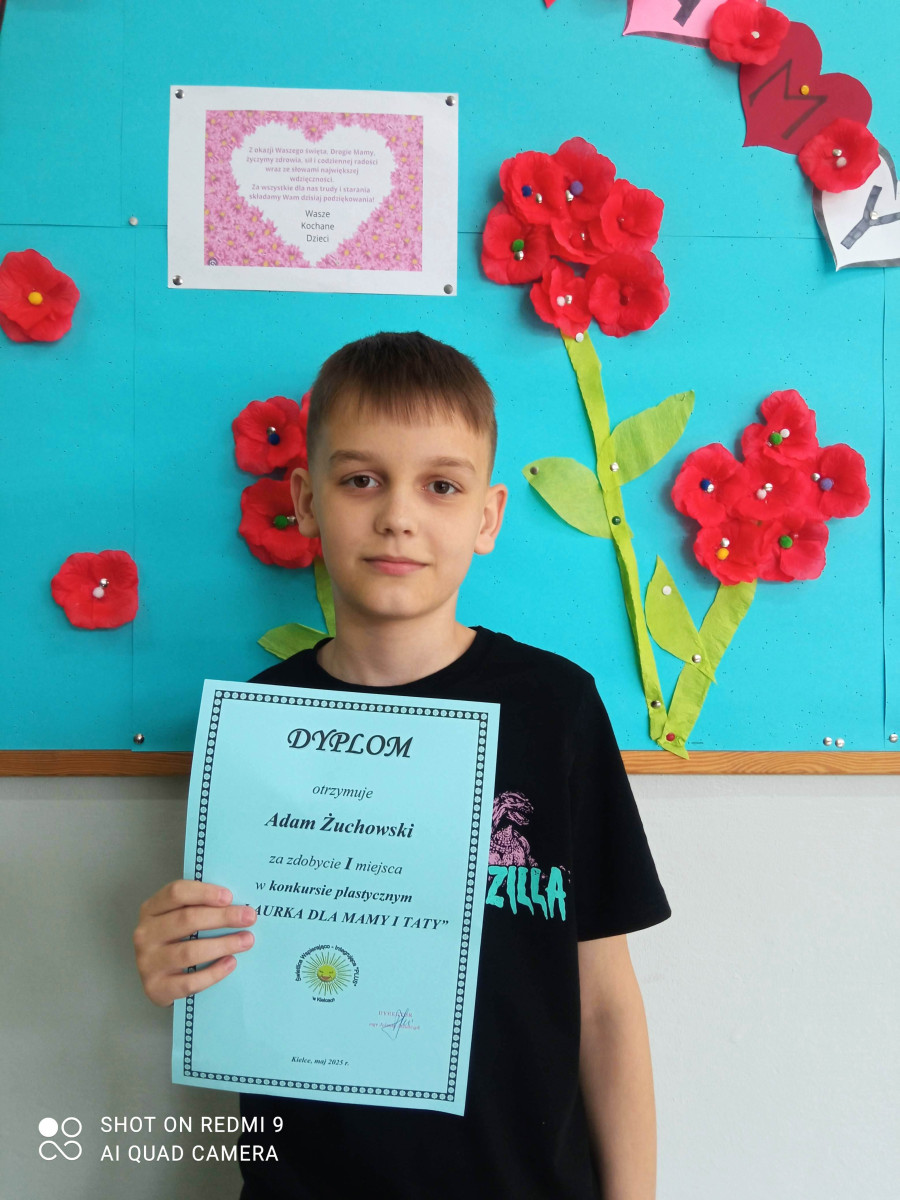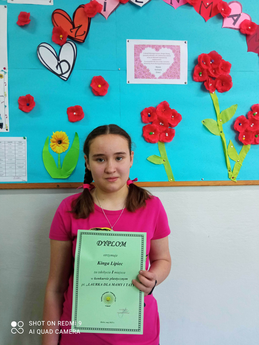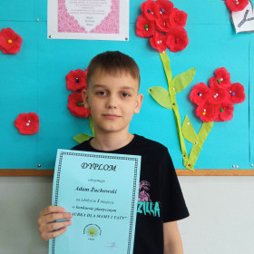 Nasi uczniowie chętnie biorą udział w konkursach plastycznych. Do międzyszkolnego konkursu, którego uczestnicy musieli samodzielne wykonać pracę w formie laurki, która nawiązywała do Dnia Matki i Ojca, zgłosili bardzo wiele ciekawych prac. Konkurs, który został zorganizowany przez Świetlicę Wspierająco - Integrującą "Plus", rozstrzygnięto 20 maja. Czworo uczniów z klas IV - VII zdobyło w nim I miejsce. Są to: Kinga Lipiec z klasy 5c, Antoni Żuchowski z klasy 5a, Klaudia Romaniec z klasy 6a oraz Wiktoria Wojniak z klasy 6b. Gratulujemy i życzymy kolejnych sukcesów!